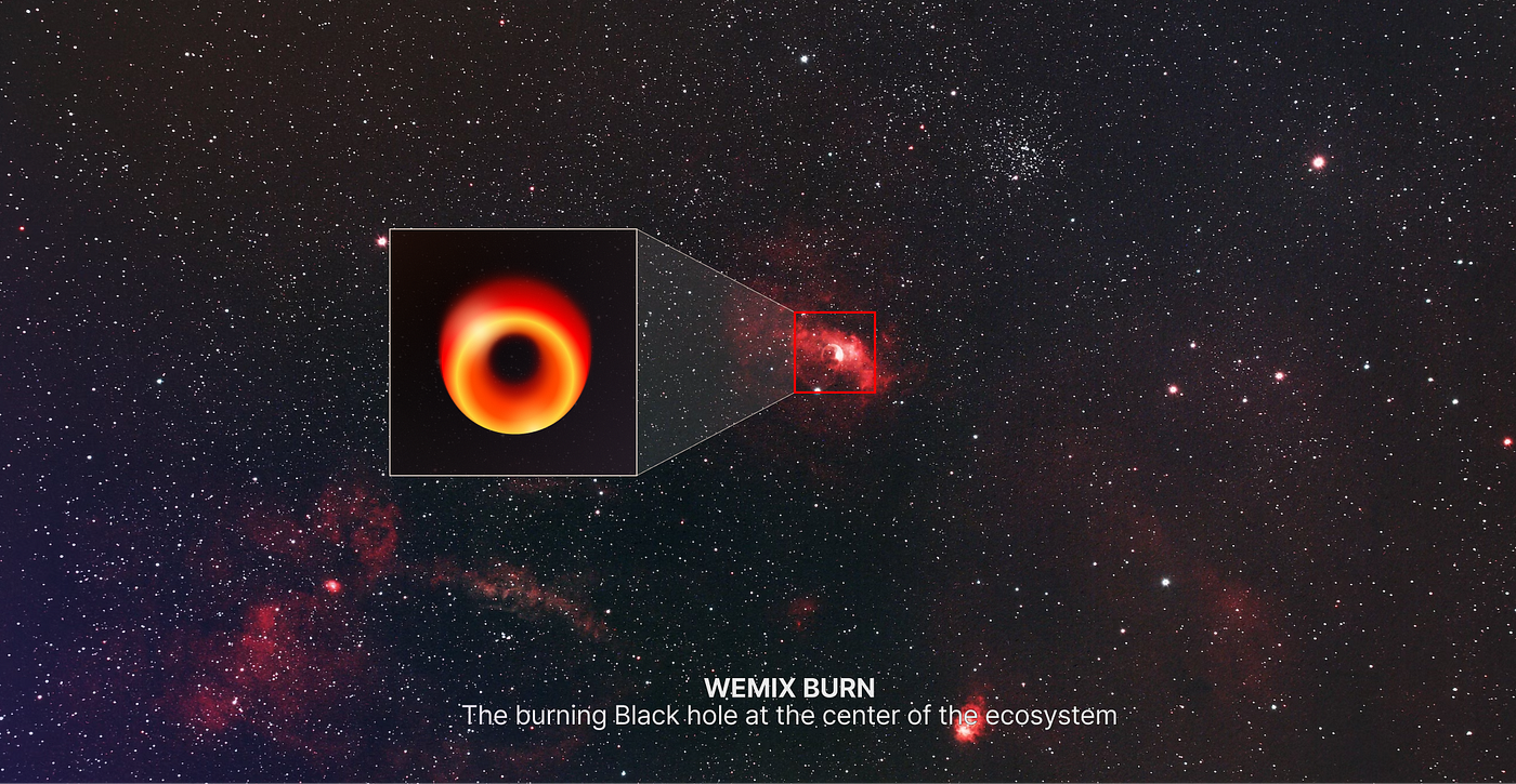 WEMIX BURN은 우주와 같이 거대한 생태계의 한가운데에서 극심한 인플레이션을 방지하는 안전망이자, 생태계가 계속해서 성장할 수 있도록 지탱하는 핵심 역할을 합니다. 우리은하가 거대한 블랙홀을 중심에 두고 존재하듯, WEMIX 생태계 내 플랫폼과 서비스, 그리고 구성원 모두는 WEMIX BURN을 구심점 삼아 저마다의 자리에서 반짝일 수 있을 것입니다.