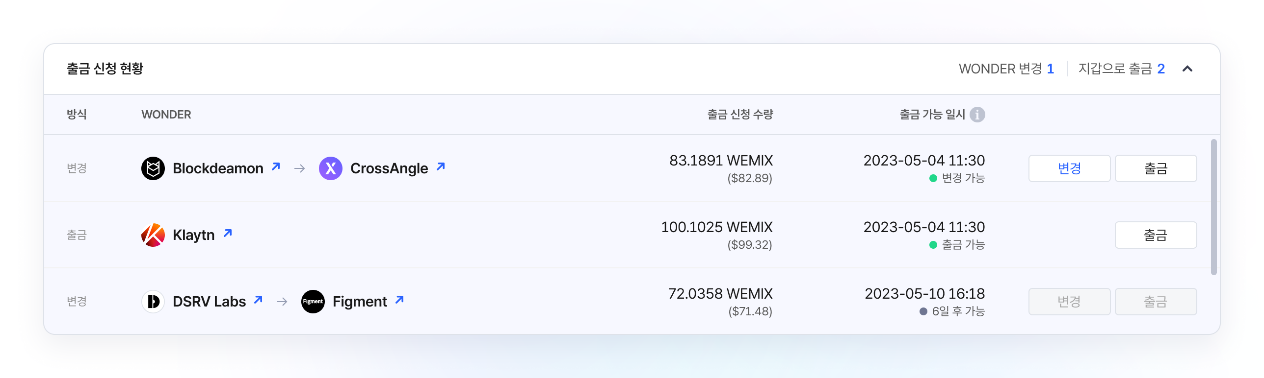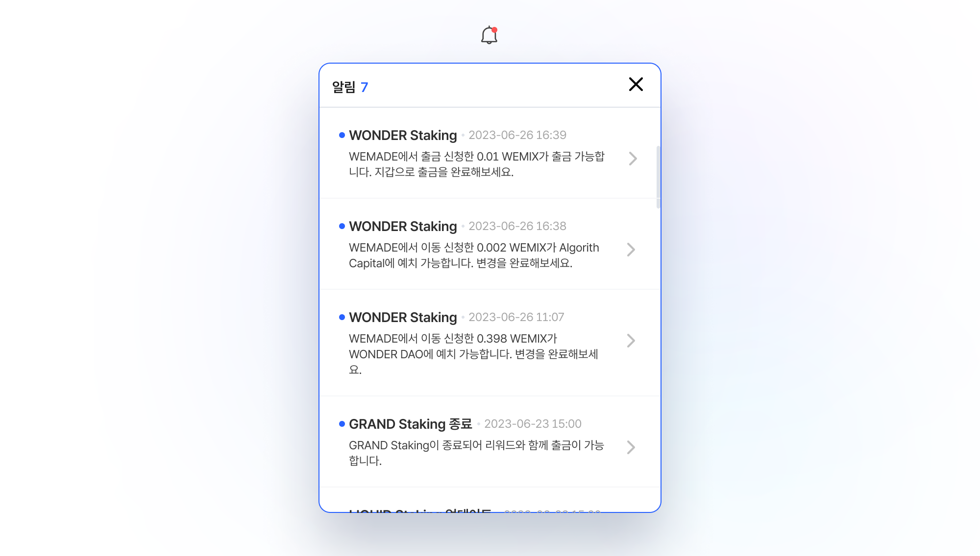 꼼꼼히 따져보고 선택한 WONDER에 스테이킹을 마쳤는데, 상품 조건이 변화한다면 어떻게 할까요? WEMIX.Fi는 상품 연수익률, 분배율 등에 변동사항이 생길 경우 7일 전에 미리 해당 예치자에게 알림을 보냅니다. 이용자가 코인을 출금, 다른 곳으로 옮길 때 소요되는 기간을 고려한 것이죠. 이용자는 알림을 통해 변동사항을 빠르게 확인하고 대응할 수 있습니다. 원한다면 ‘WONDER 변경하기’를 이용해 이미 예치한 WEMIX를 더 좋은 조건의 WONDER에게로 옮길 수 있죠.