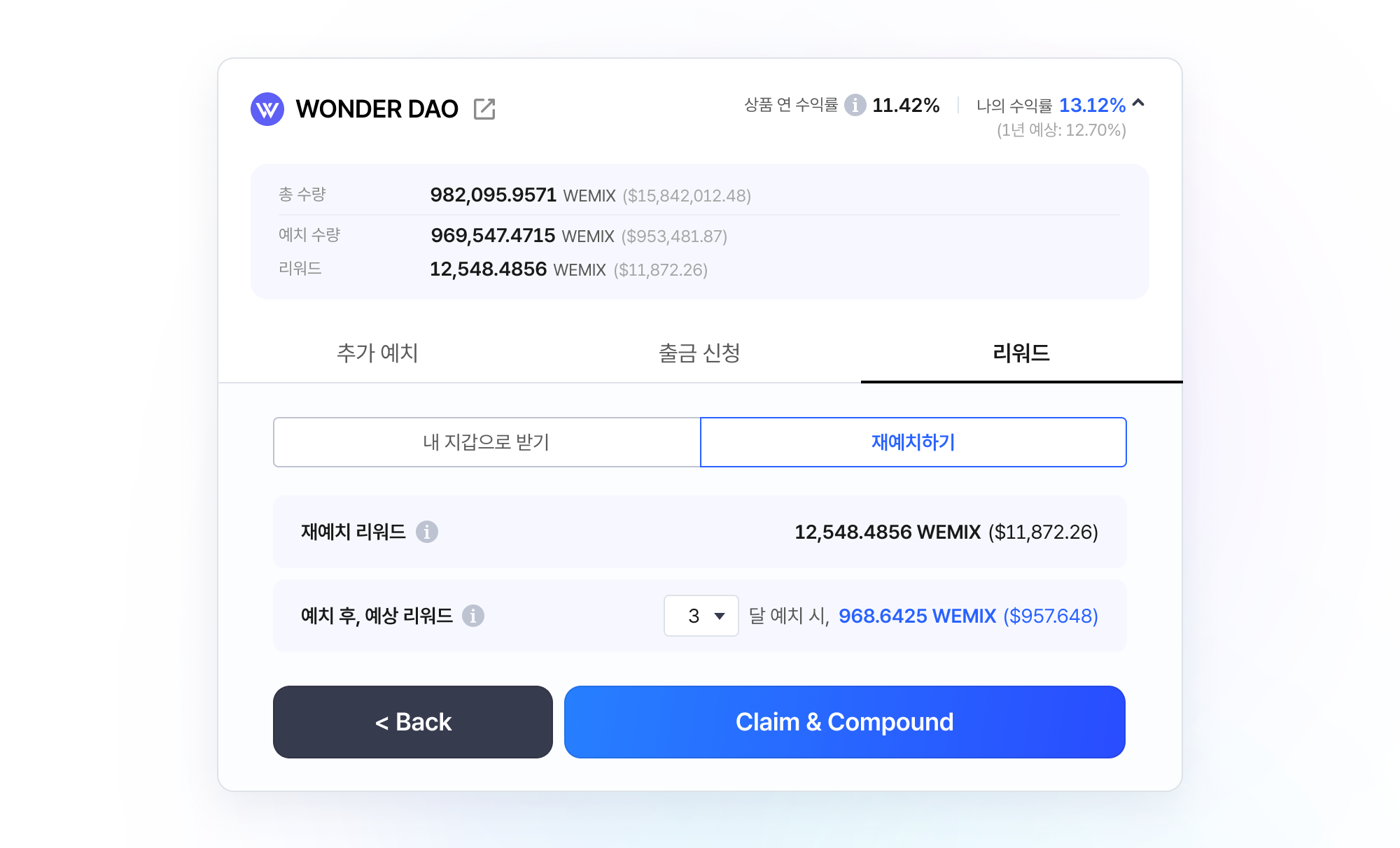 WONDER Staking 이용자는 WEMIX를 예치함에 따라 실시간으로 획득한 리워드를 어떻게 운용할 것인지 선택할 수 있습니다. 리워드를 내 지갑으로 옮겨 다른 곳에 사용할 수도, 다시 WONDER에 스테이킹해 더 많은 리워드를 획득할 수도 있죠. WEMIX.Fi는 만약 리워드를 재예치할 경우 예치 기간에 따라 발생할 예상 리워드 값을 보여주며 이용자가 결정에 참고할 수 있도록 합니다.