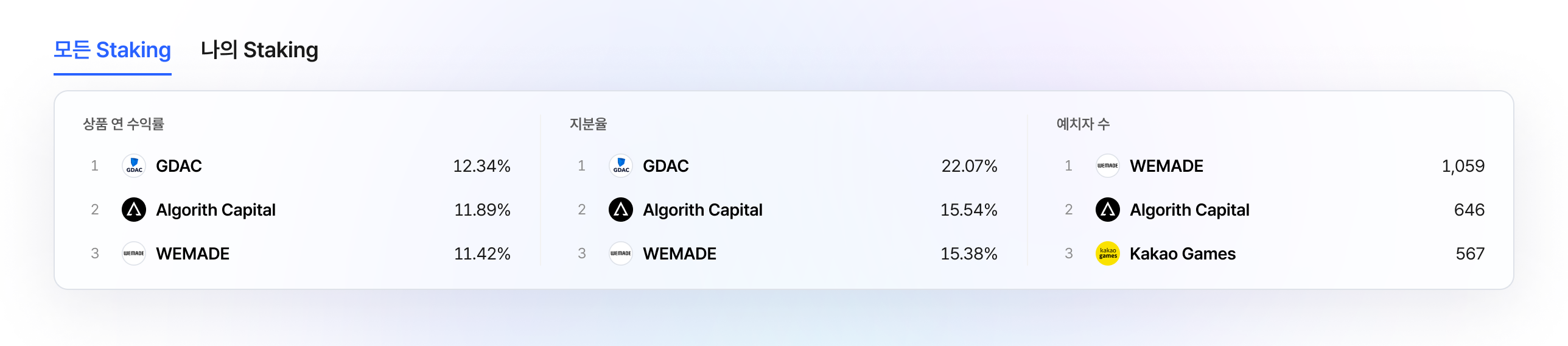 WONDER Staking의 전체 상황을 확인할 수 있는 ‘모든 Staking’ 페이지 상단에는 상품 연수익률, 지분율, 예치자 수 각각이 랭킹 형식으로 나타납니다. 지표별 상위 3개 WONDER를 강조함으로써 이용자가 상대적으로 더 높은 경쟁력을 갖춘 WONDER를 직관적으로 알 수 있도록 했죠. 이는 이용자의 편의성을 높일 뿐 아니라, 순위권에 들기 위한 WONDER 간 경쟁을 촉진합니다.