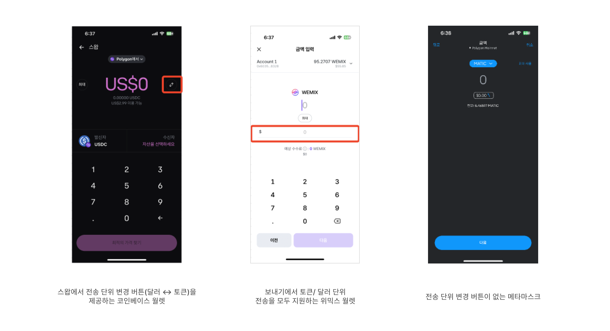 월렛에서 보내기, swap, 보유자산 시세 확인을 해보며 공통적으로 나온 니즈는 바로 통화 단위 설정을 할 수 있으면 좋겠다는 의견이었습니다. 테스트 기간 동안 사용해본 네 개의 월렛 중 위믹스 월렛과 코인베이스 월렛만 보내기/ swap 기능에서 전송 단위 변경이 가능했습니다. 나머지 두 월렛은 무조건 코인(토큰) 단위로만 입력할 수 있도록 설정되어 있었습니다. 코인 단위만 제공하다 보니 특정 금액 만큼 전송 및 스왑하고 싶을때 정확한 금액을 맞출 수 없어 어려움이 발생했습니다. 코인 단위로 대략적인 금액을 가늠하며 몇 번씩 입력해보고, 최대한 비슷한 금액이 되었을 때 거래를 진행해야 했다보니 시간도 오래걸리고 불편했습니다.