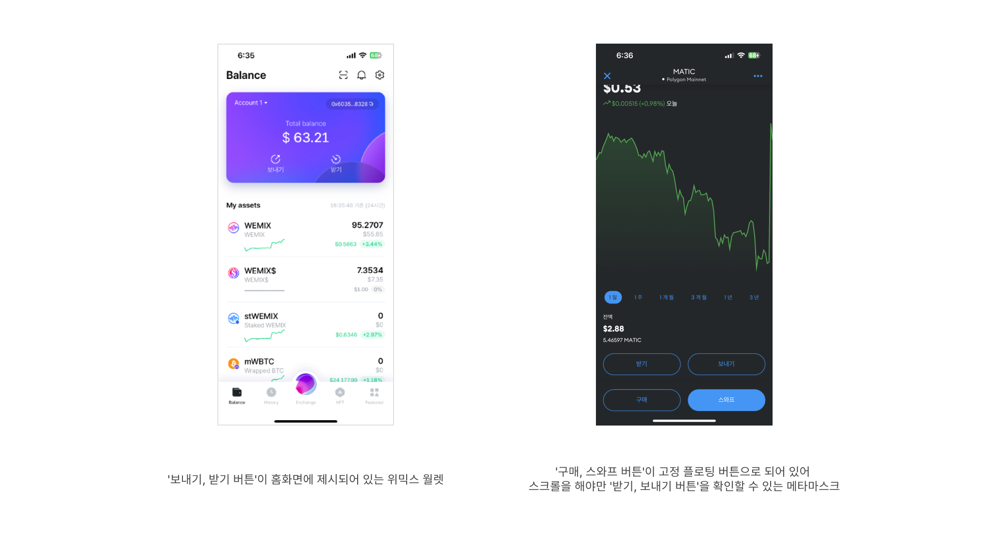 그럼 암호화폐 월렛에는 어떤 기능을 바로 접근할 수 있도록 디자인하는게 필요할까요? 월렛에서 가장 핵심적인 기능 중 하나는 바로 ‘보내기 / 받기' 입니다. ‘보내기’란, 내 월렛에 보유하고 있는 자산을 타 주소로 전송하는 기능이고, ‘받기'는 타 주소나 거래소로 부터 암호화폐를 입금 받는 기능이죠. 은행앱과 비교한다면 이체 기능과 유사하다고 볼 수 있겠네요.
