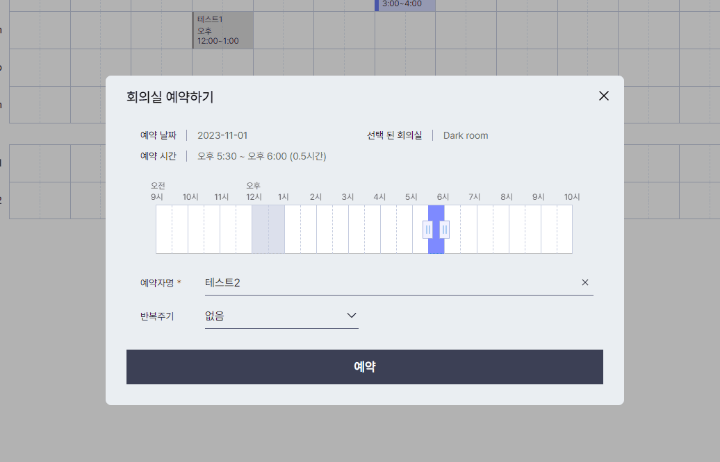 최종적으로 완성된 화면은 이전과 다르게 회의실 중심이 아닌 시간을 기준으로 어떤 회의실이 비어 있는지를 더 직관적으로 나타내도록 변경되었습니다. 그뿐만 아니라, 오른쪽의 예약 패널은 제거하고 회의실 시간 선택했을 때 사용자가 다음 단계를 명확하게 이해할 수 있도록 모달 형식으로 변화되었습니다. 또한, 현재 시간을 구분선으로 표시함으로써 즉시 이용 가능한 회의실을 쉽게 식별할 수 있도록 하였습니다.