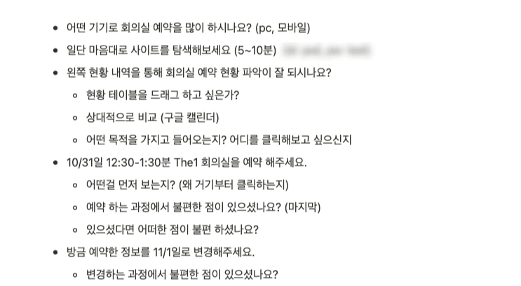 사용자 조사는 어떻게 준비하고, 어떻게 진행하고, 어떤 결과물을 도출해야 하는지 등 관련해 모르는 게 너무 많은 상태에서 시작했기 때문에 리서치팀에 도움을 요청하기 전 우리가 준비한 질문 리스트는 대부분 사용자가 수행하는 테스크 중심의 질문들로만 이루어져 있었습니다. (이거 해보세요, 저거 해보세요)