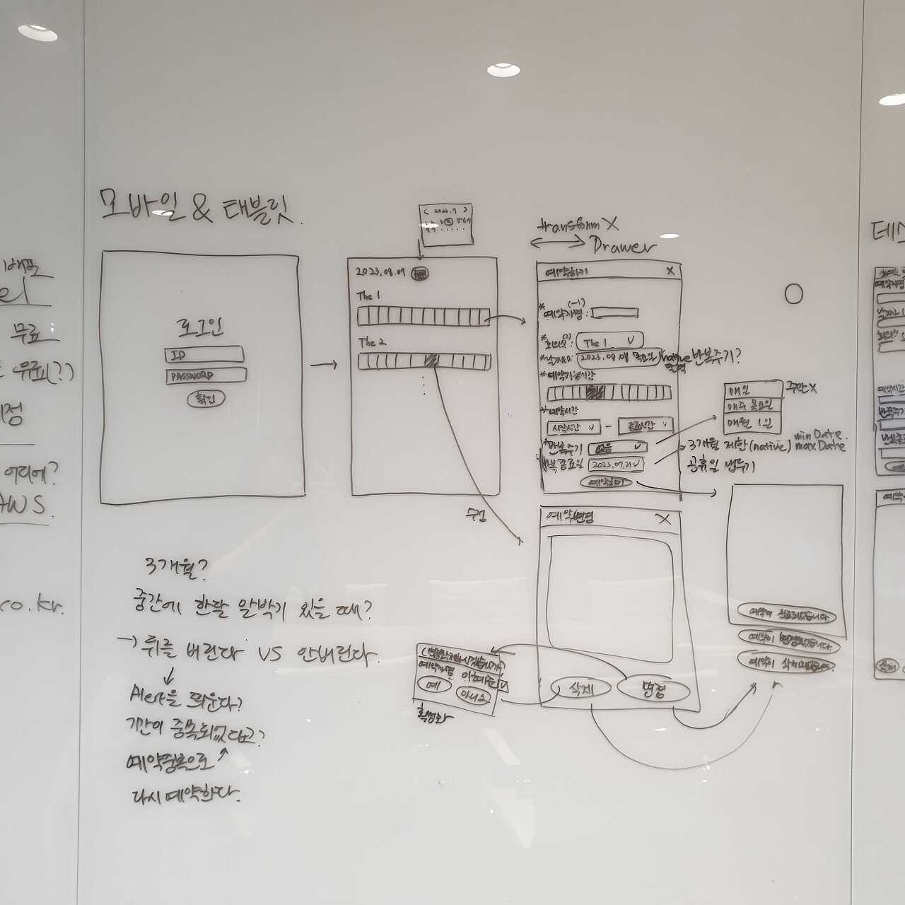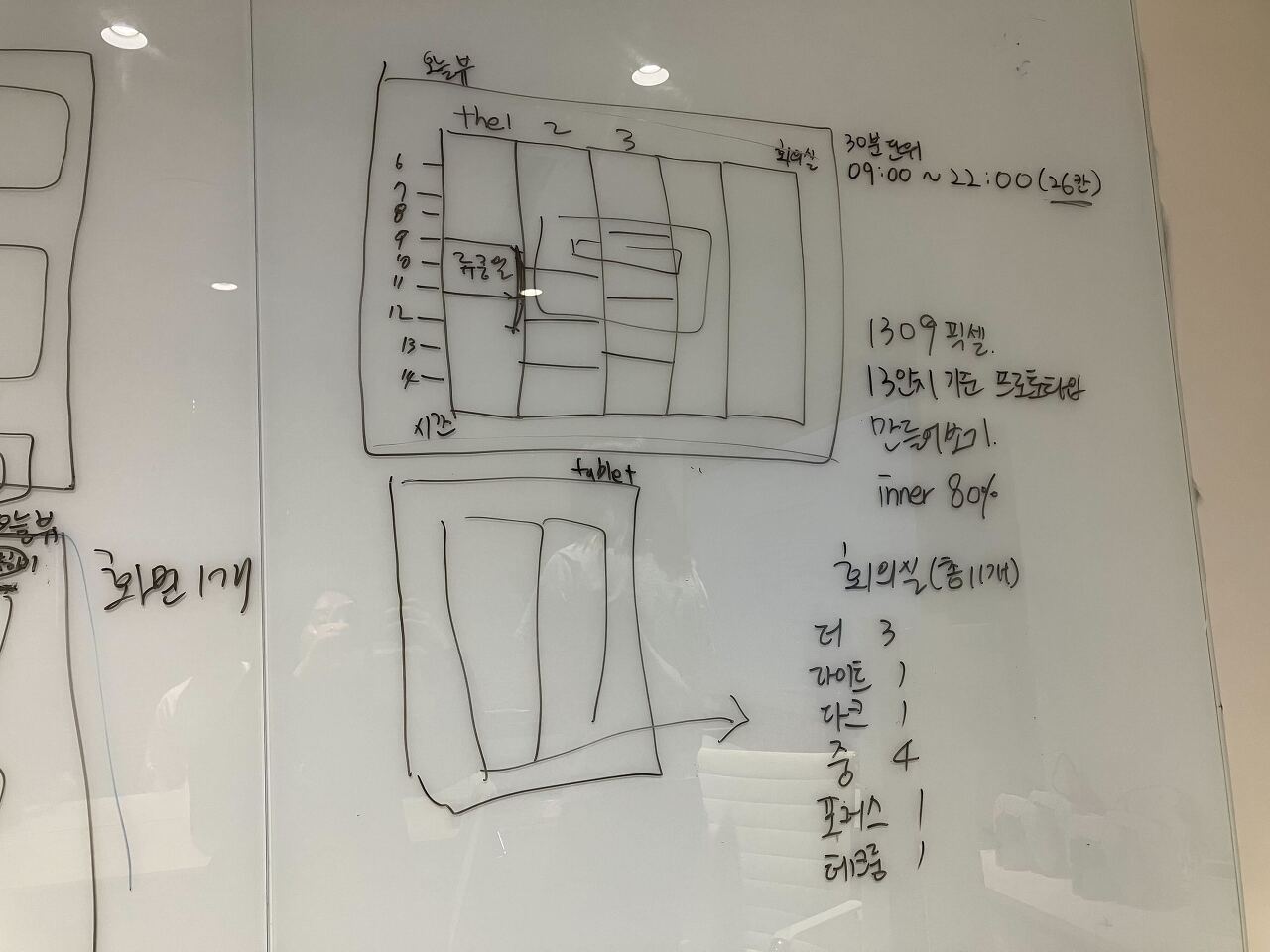 여러 화면을 그려보면서 시간을 x 또는 y 축으로 할지, 해상도에 따라 한 화면에 몇 개의 회의실이 표현되어야 하는지, 예약 과정을 최대한 간소화하기 위해 플로우를 어떻게 구성할지 등 다양한 논의와 고민을 진행하였습니다. 그리고 모바일, 태블릿 화면은 동일한 UI로 구성하여 동일한 사용자 경험을 제공하고, 작은 화면에서의 회의실 배치에 대한 고민도 함께 진행되었습니다.