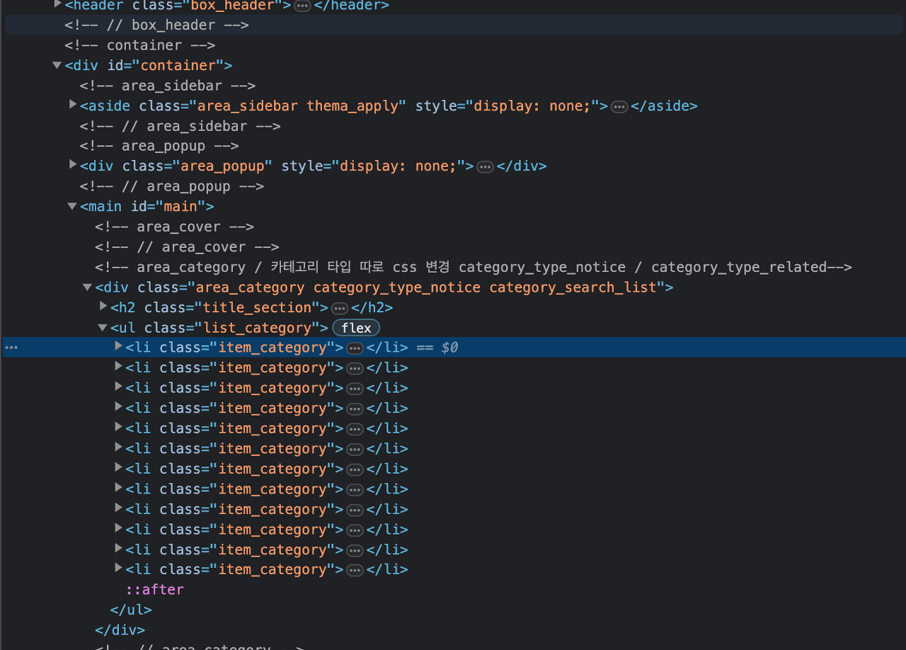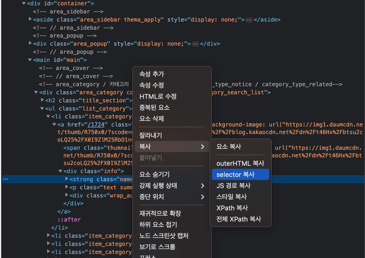 이후 해당 페이지에서 가져오고자 하는 데이터 리스트가 있는 DOM요소를 요소검사창을 통해 확인해줍니다.