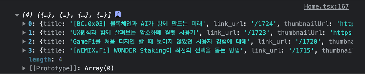 파싱해준 데이터를 console에 로그를 출력해보면 이렇게 아주 잘 정렬되어 나오게 됩니다.