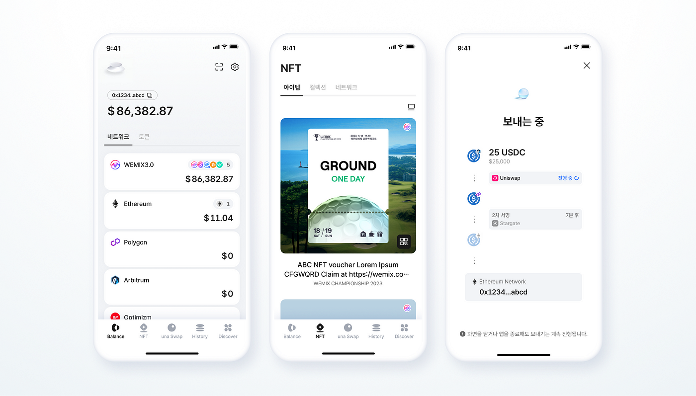 블록체인 시장의 코인과 토큰은 다양한 네트워크 종류만큼이나 제각기 다른 가치를 갖기 때문에 이용자 입장에서는 ‘내 자산이 얼마인지’ 곧바로 파악하기가 어려운데요. Arbitrum(아비트럼), Avalanche(아발란체), Binance(바이낸스), Ethereum(이더리움), Optimism(옵티미즘), Polygon(폴리곤), Klaytn(클레이튼), WEMIX 3.0(위믹스 3.0)… 이 모든 네트워크의 자산을 una Wallet으로 한눈에 살펴보고 한 곳에서 관리할 수 있습니다. 이 체인 저 체인을 오가며 들이는 시간과 에너지도 이용자의 소중한 자산이기에 허비하게 둘 수 없죠.