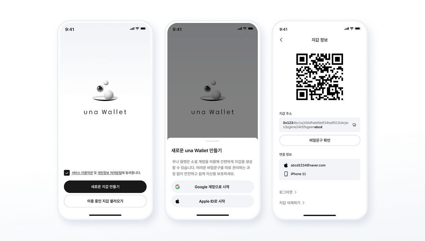 더 저렴한 수수료를 찾는 노력, 여러 서비스를 왔다 갔다 하는 수고, 흩어진 정보를 그러모으는 데에 드는 품, 이용자가 책임지고 관리해야 하는 비밀 문구… 이런 점이 누군가에겐 블록체인과 가까워질 수 없는 진입장벽일 겁니다. 여러 블록체인 기반 서비스를 접해본 이용자라면 이미 익숙할지도 모르지만, 사실 더 쾌적하고 만족스러운 경험은 친숙도와 상관없이 모두에게 필요한 것이기도 하죠. 더 많은 사람이 쉽고 간편하게 블록체인을 누릴 수 있도록 하기 위해, una Wallet은 블록체인 지갑이 가진 우수한 보안은 유지하되 그간 당연히 여겨졌던 이용자 부담을 덜어냈습니다. 이제 una Wallet과 함께, 전에 없이 유쾌한 블록체인 생활을 시작해보세요.