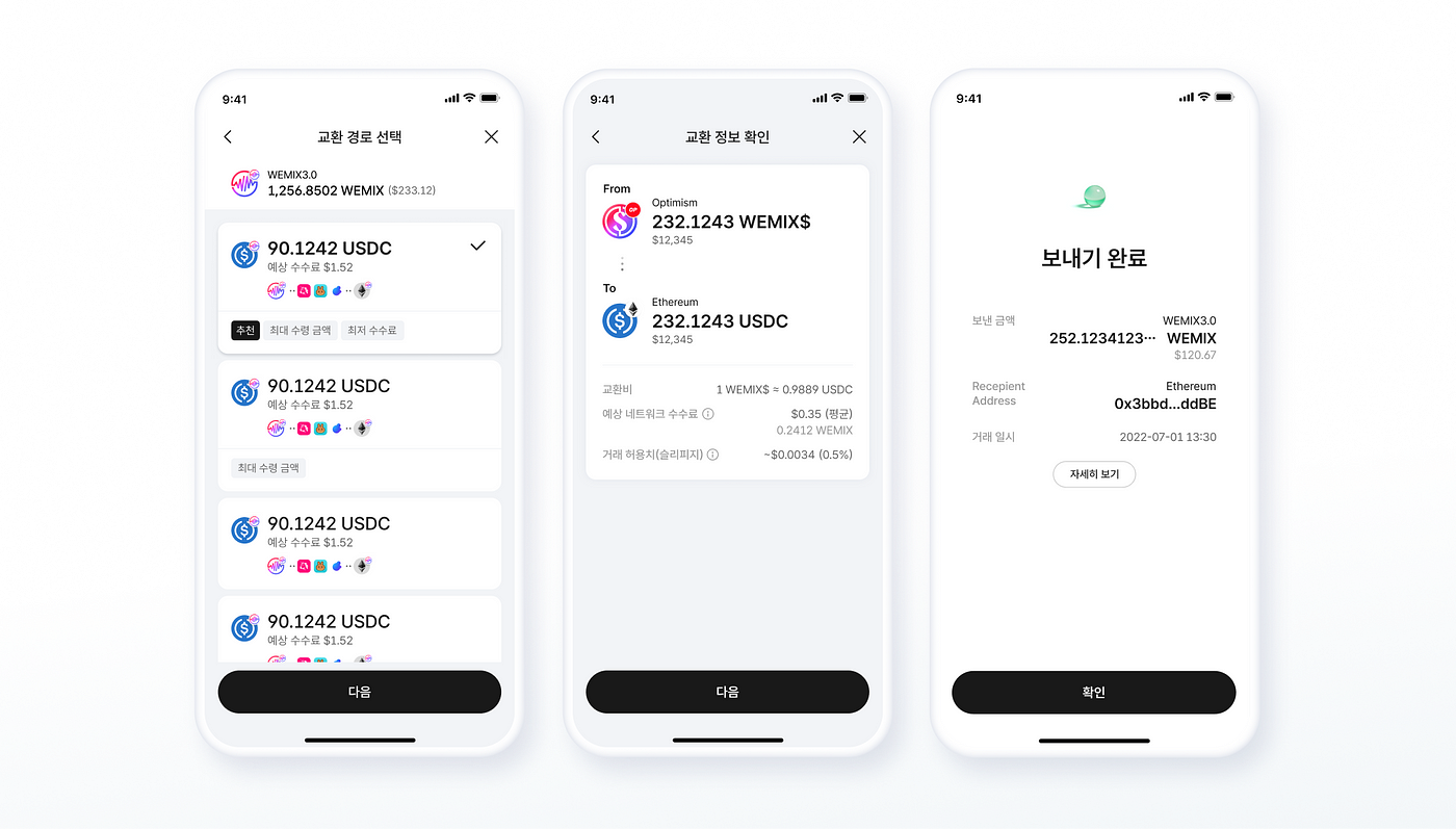 자산 관리에서 가장 중요한 부분 중 하나는 최소 비용, 최대 이익으로 만족을 극대화하는 것인데요. 토큰 교환 과정에서 여러 네트워크를 거치다 보면 예상보다 많은 수수료를 지불하게 되거나 거래가 지연되는 경우가 발생해 이용자가 자산 운용에 차질을 빚기도 합니다. una Wallet의 una Swap(우나 스왑)은 이러한 불편을 막기 위해 토큰을 교환하는 데에 드는 수수료, 시간, 최종 수령액 등을 계산해 다양한 교환 경로를 추천하고, 이용자가 최적의 거래를 선택할 수 있게 합니다.