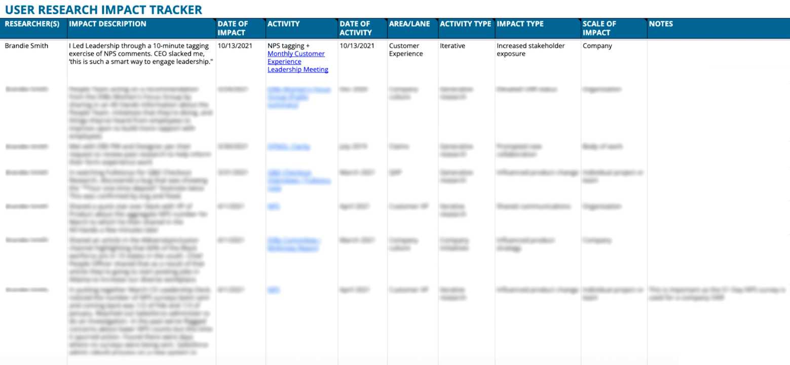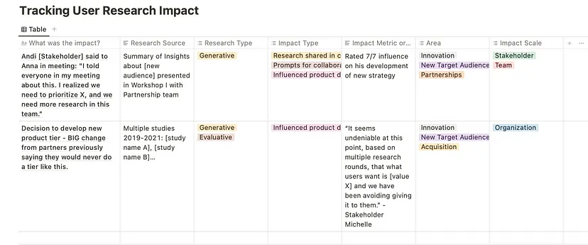 임팩트를 어떤 방법으로 측정할 것인지 리서치 시작 단계에서 이해관계자와 함께 정의합니다. 아래와 같은 내용을 기준으로 미리 템플릿을 마련해 두고 트래킹할 수 있습니다.
