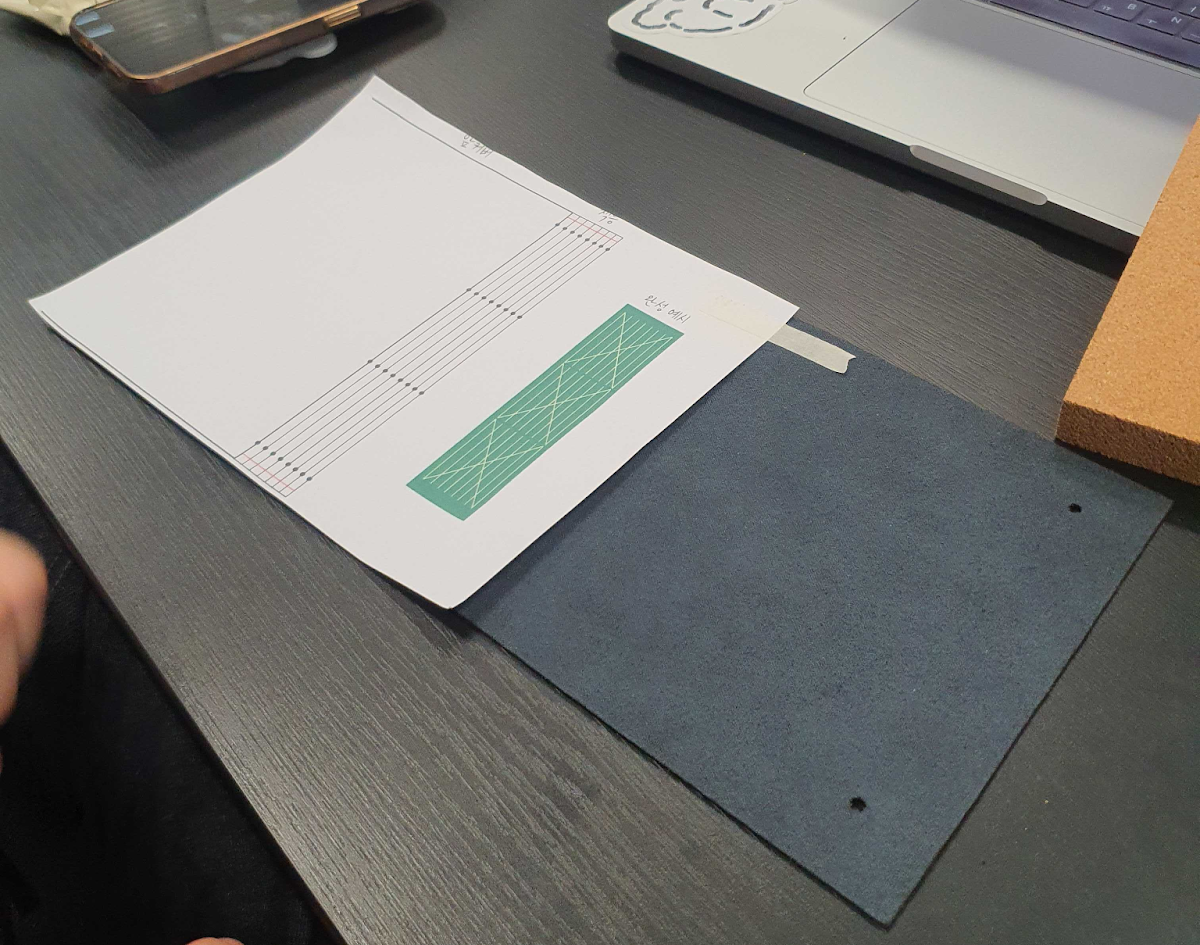가죽 뒷면에 도안을 고정한 후, 타공용 코르크판을 받친 상태로 송곳을 이용해 도안에 있는 검은색 점에 맞춰 타공하면 됩니다. 여기서 주의할 점은 최대한 송곳과 가죽이 수직인 상태로 뚫어야 형태가 일정하게 나온다고 합니다.