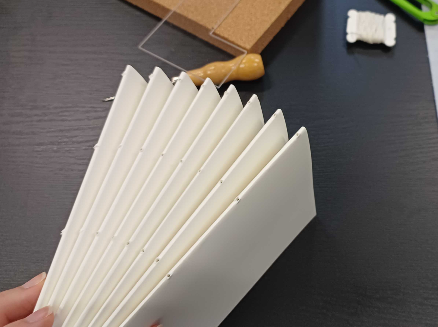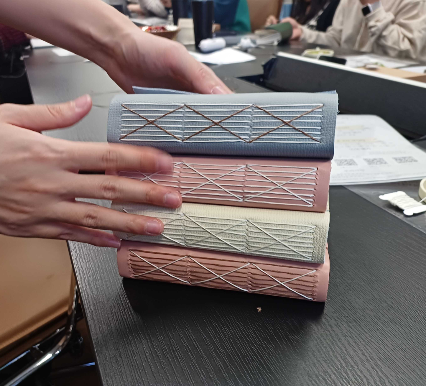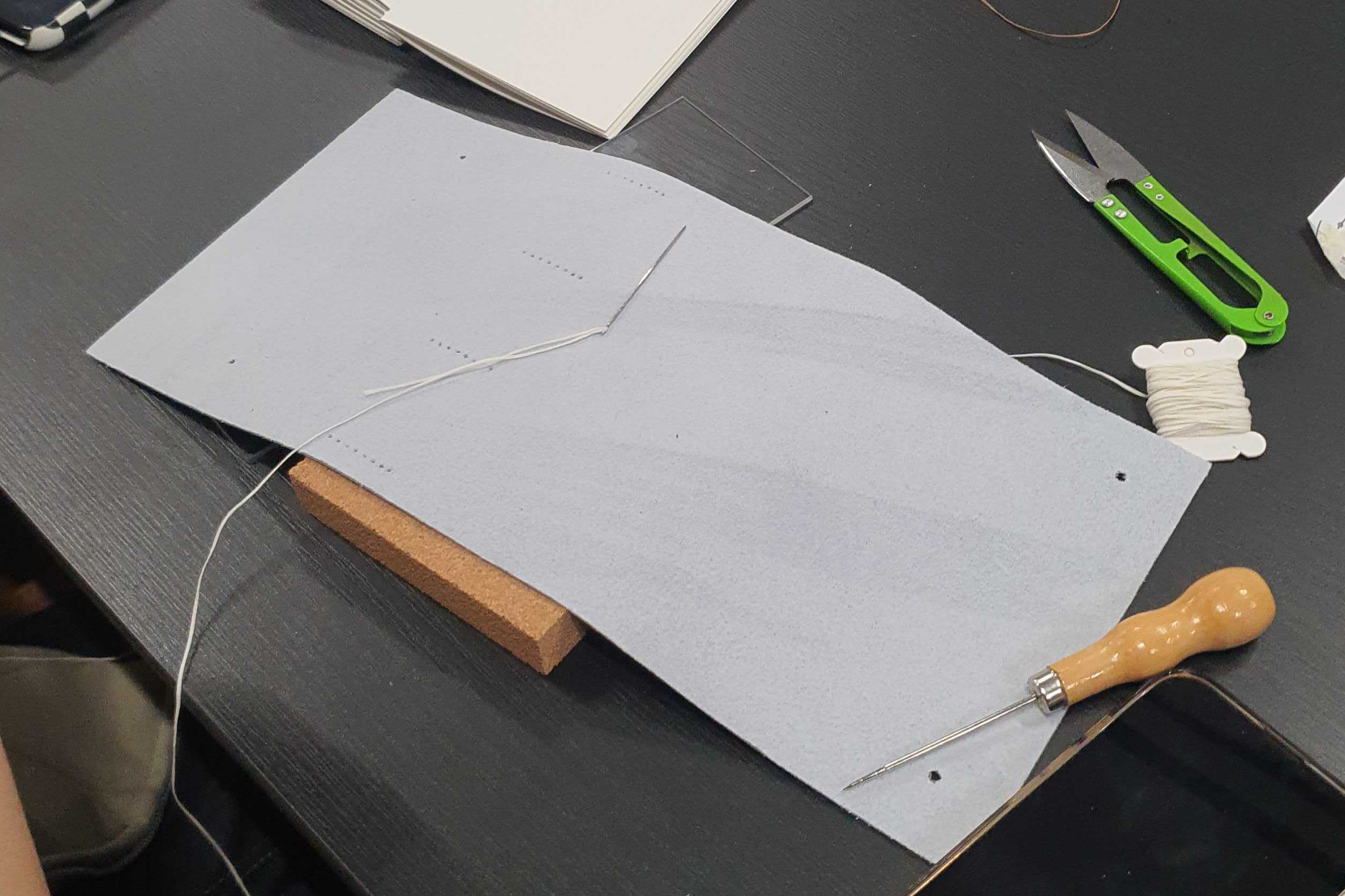 바인딩은 가죽 타공, 속지 타공, 바인딩, 여밈의 4단계로 진행되었습니다.