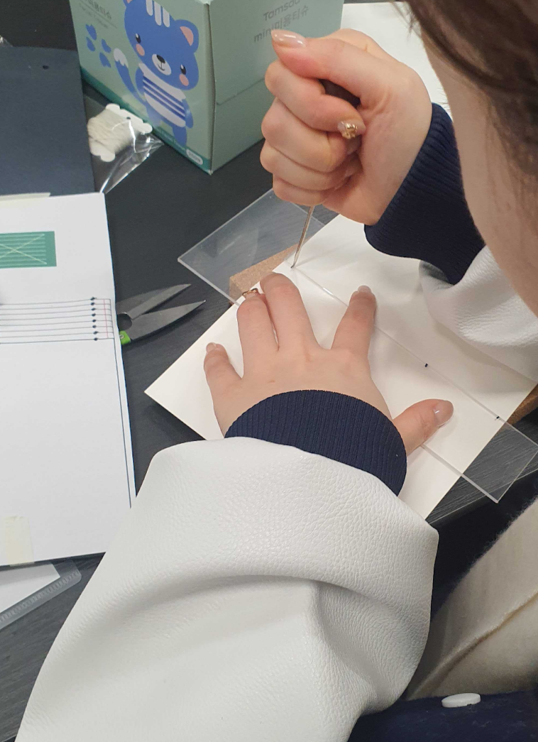 가죽 타공이 완료되었다면 속지 타공 과정으로 넘어가게 되는데요. 속지의 접힌 면에 직각자를 대고 표시된 부분에 맞춰 최대한 중앙에 타공하면 됩니다. 이 과정에선 송곳을 비스듬하게 기울여야 균일한 타공이 가능했습니다. 여담으로 많은 분이 이 과정에서 강사 선생님께 속지 여분을 찾았더랬죠.