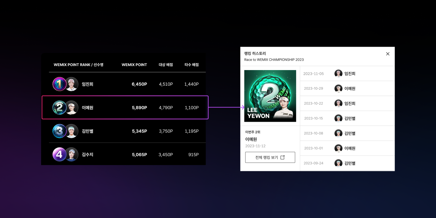 KLPGA 2023시즌에는 블록체인 기반의 'Race to WEMIX CHAMPIONSHIP(이하 RWC)'이 도입됐습니다. 시즌 정규투어에 WEMIX 포인트 시스템을 적용해 대회 결과에 따라 선수들에게 점수와 순위를 부여하고, 이를 블록체인에 기록했습니다. 그리고 'Race to WEMIX CHAMPIONSHIP 2023 NFT(이하 RWC NFT)' 컬렉션을 발행해 선수들의 점수 누적 상황을 팬들에게 시각적으로 전달했습니다. 블록체인과 NFT(Non-Fungible Token)를 활용해 선수와 팬이 대회를 더 즐길 수 있도록 돕는 장치를 고안한 것이죠.
