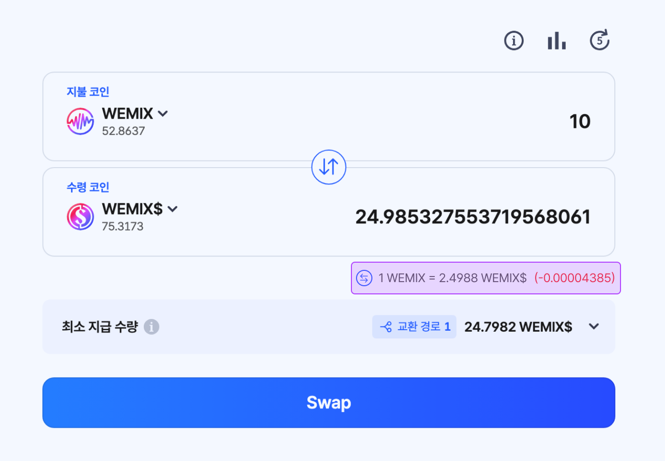 교환비 정보 전달을 위해서는 교환비 등락을 시각적으로 보여주는 기능을 추가했습니다. 시세 정보 옆에 5초 전과 현재의 교환비 등락 차이를 색상으로 표현했습니다. 이용자가 스왑 거래를 하려는 중에도 교환비의 등락 여부를 한눈에 알 수 있도록 말이죠.