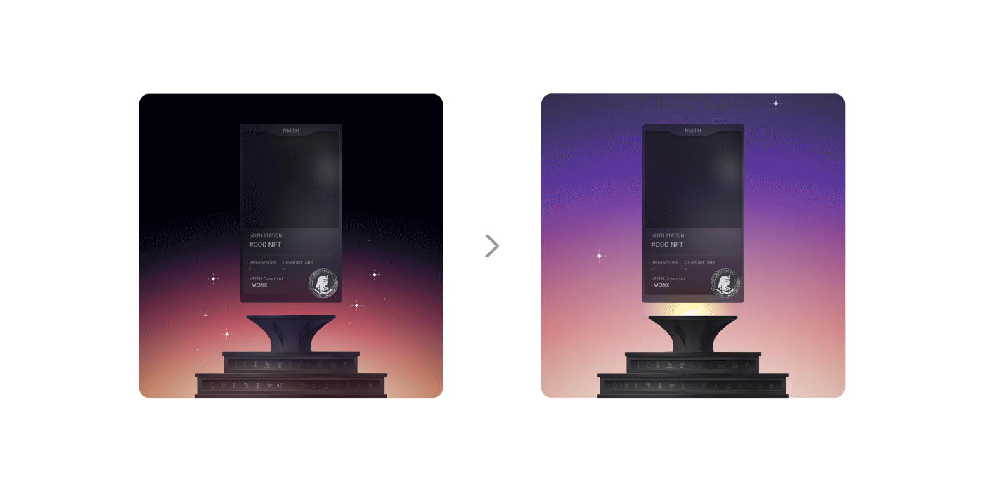 Covenant Claim을 시작하면, 이용자가 선택한 NFT는 NEITH Altar에 오르고 그 위에 NEITH의 상징이 새겨진 검은 장막이 드리웁니다. 이어 NFT가 재가 되어 흩어지는 장면을 바라볼 수 있죠. 불꽃 위로 떠오른 암호화폐와 그 주위를 돌며 궤적을 그리는 구체의 움직임은, NEITH Vault에서 이용자의 지갑으로 이동하는 NEITH Covenant의 트랜잭션을 형상화한 것입니다. 이 모습은 마치 위성을 둔 행성처럼 보이기도 하는데요. 여러 이용자가 저마다의 Covenant Claim을 이루는 상황이 하늘을 수놓은 별들로 반짝이는 Altar의 풍경이 된 것이죠.