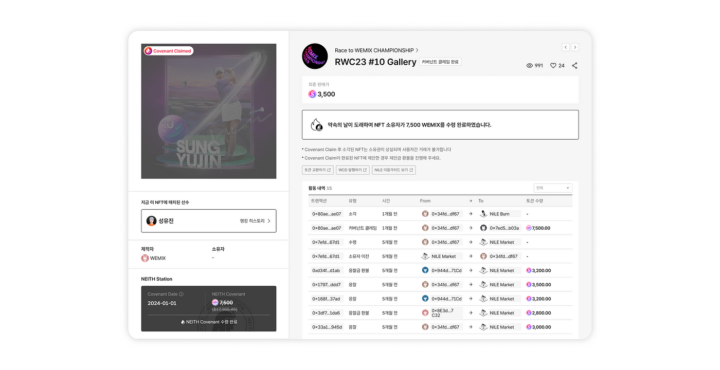 Covenant Claim을 완료하면 마침내 NEITH Covenant와 함께하는 여정이 마무리됩니다. 하지만 이것이 NEITH NFT의 끝은 아닙니다. NFT를소각하면 본래 기능이나 소유권은 사라지지만, ‘Marketplace’에서 이러한 경험을 언제든 추억할 수 있습니다. ‘Covenant Claimed’가 표시된 NFT를 선택하면 민팅부터 소각까지의 모든 과정을 ‘활동 내역’에서 살펴볼 수 있죠.