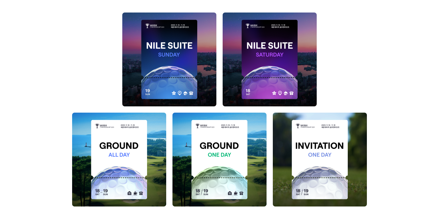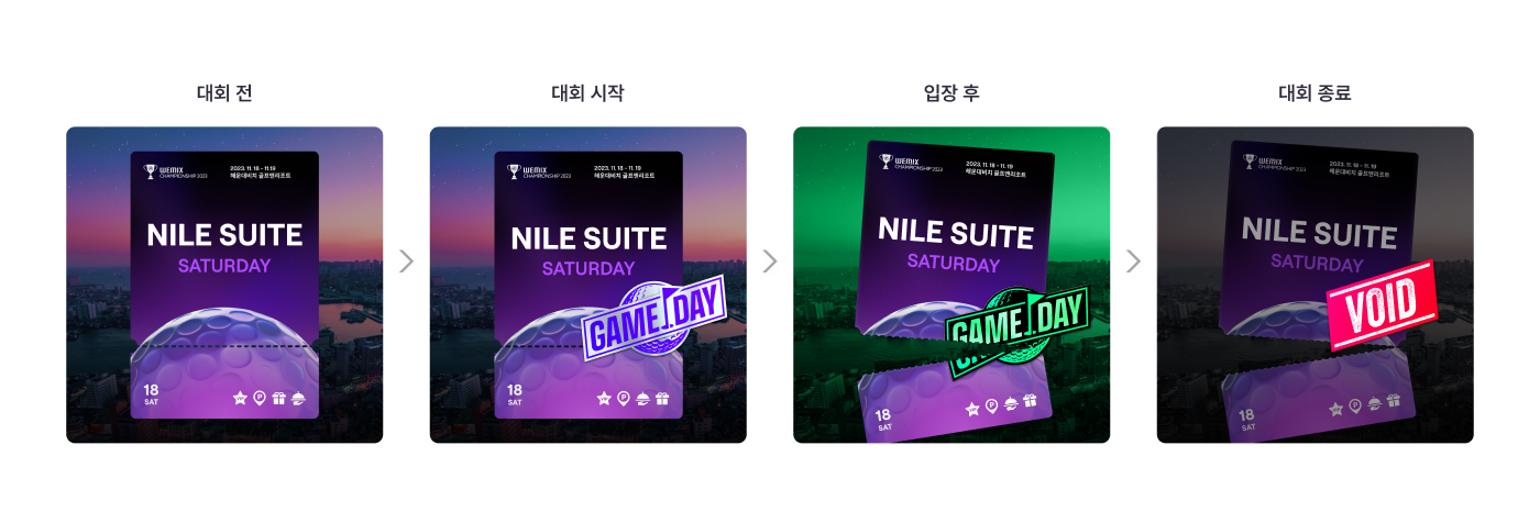 WC 2023의 티켓은 VIP 티켓인 NILE Suite(나일 스위트)와 일반 티켓인 Ground(그라운드)로 나뉘었습니다. 티켓 NFT는 대회의 입장을 위해서는 물론이고 현장의 시설과 식음료를 이용하기 위한 이용권의 역할도 수행했죠. 갤러리가 현장에서 티켓 NFT를 사용하는 순간이 많으므로 티켓을 통해서도 미리 현장감을 느낄 수 있으면 좋겠다고 생각했습니다. 그렇기에 대회가 개최된 부산과 해운대 리조트의 풍경을 티켓 NFT에 넣은 것은 부산을 찾은 갤러리를 위한 디자인이라 할 수 있죠.