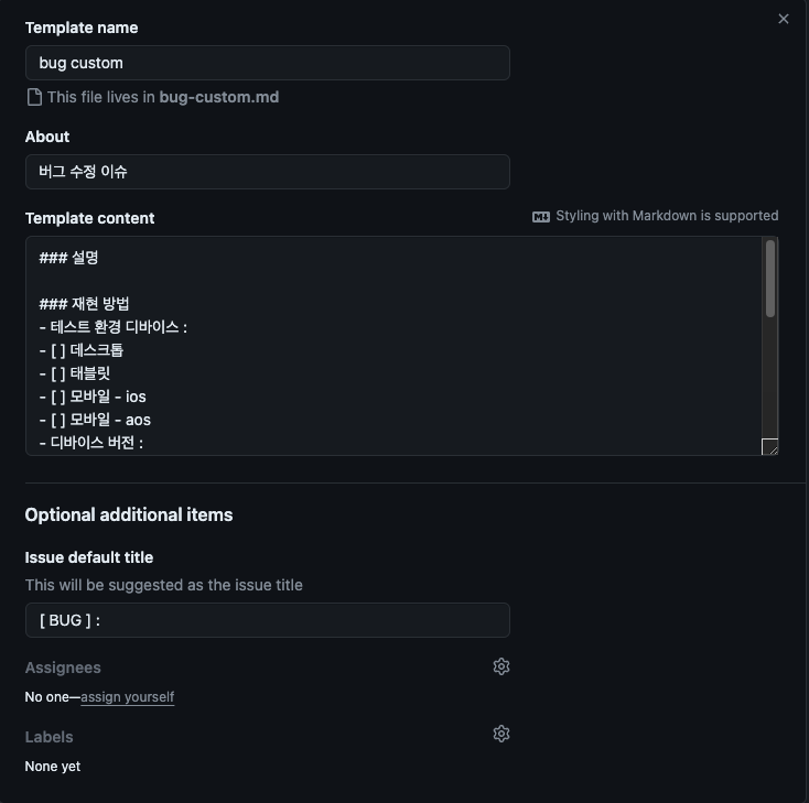 repository 내 [ Setting > General > Features > issues ] 탭에서 템플릿 기능 추가 마크다운 양식으로 추가해서 문서로 저장할 수 있습니다.