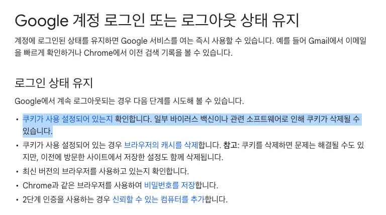 우선 공식 문서를 통해 힌트를 얻어 보겠습니다. 기본적으로 저희는 구글에서 계속 로그인 상태를 유지하고 싶습니다. 하지만 그렇지 못하는 경우에 대해 구글은 '쿠키' 사용 설정을 확인해 보라 알려줍니다. 이를 통해 구글은 로그인 유지에 '쿠키'를 활용한다는 것을 알 수 있습니다.