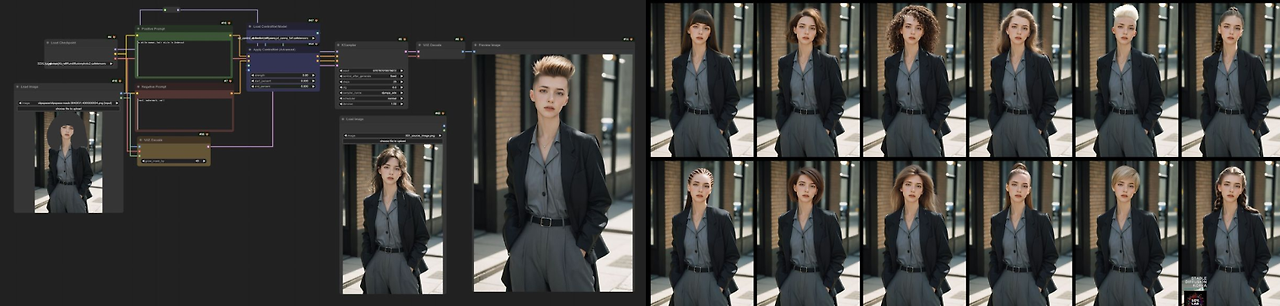 (왼)Comfy UI 화면, (오)결과물; 단순 컨트롤넷 Canny 사용 및 프롬프트 적용으로 다양한 헤어스타일 변경 (출처: 최돈현-Stable Diffusion Korea 페이스북)
