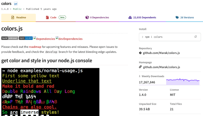 colors.js는 Node.js에서 로그 및 텍스트의 콘솔 출력에 다양한 색상을 추가하는 기능을 제공해 아주 널리 사용되던 라이브러리입니다.