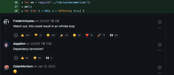 colors.js의 최신 버전에는 무한 루프 코드와 "LIBERTY! LIBERTY! LIBERTY!”라는 단어가 출력되는 코드를 의도적으로 추가해 해당 라이브러리들을 사용하는 수천 개의 프로젝트들에 문제가 발생되도록 일종의 테러를 감행한 사건입니다.