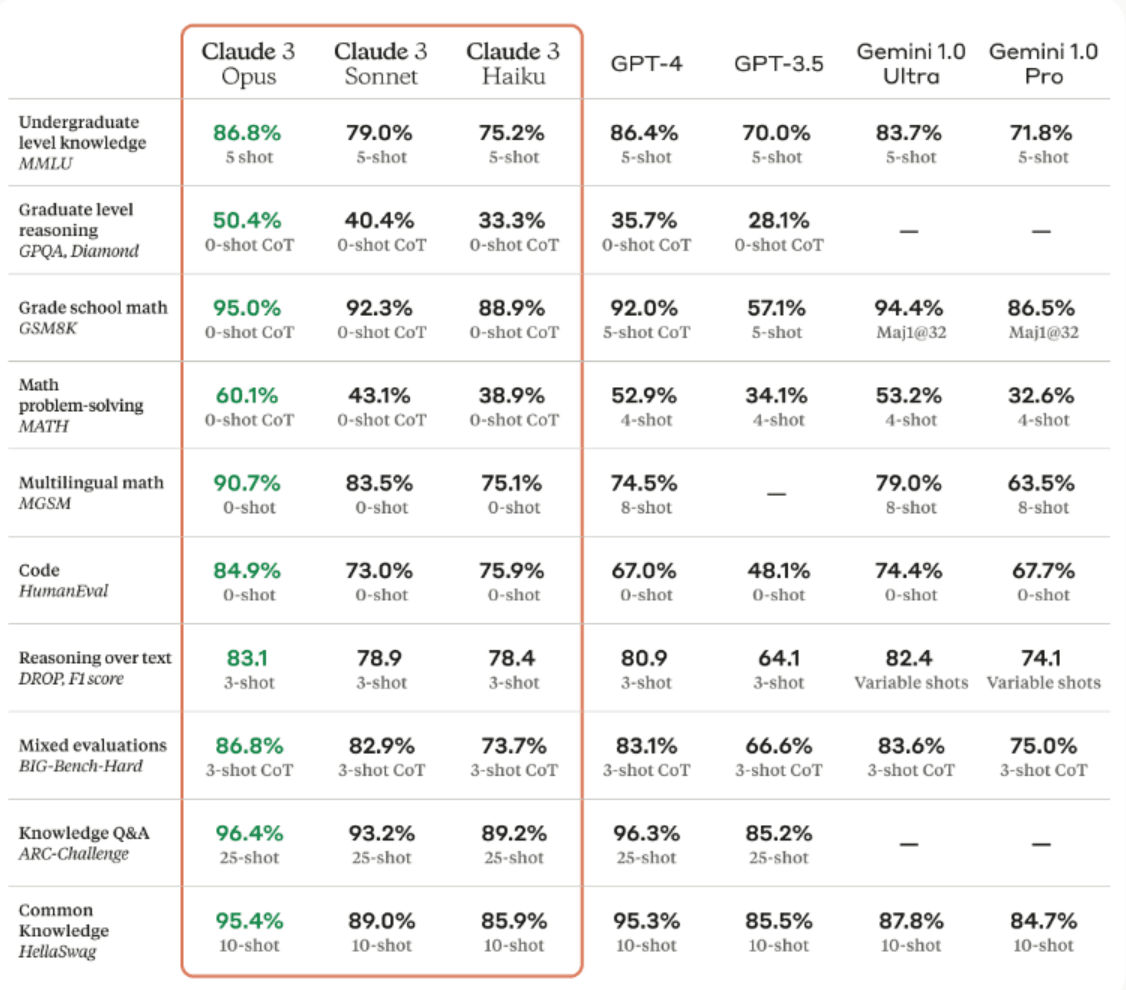 Anthropic에서 공개한 Claude 3.0 성적표는 다음과 같습니다.