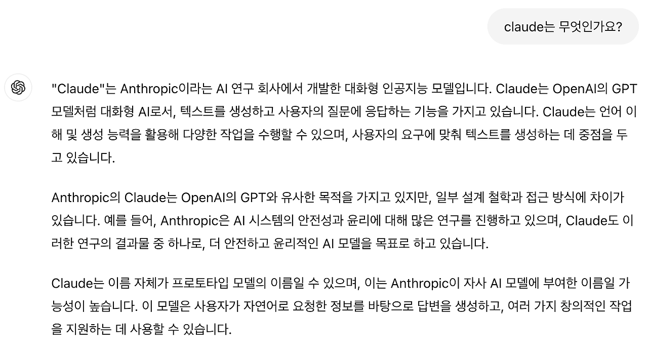 ChatGPT는 다음과 같이 답변해 주었습니다. 두 모델의 답변 방식이 확실히 차이가 나네요.