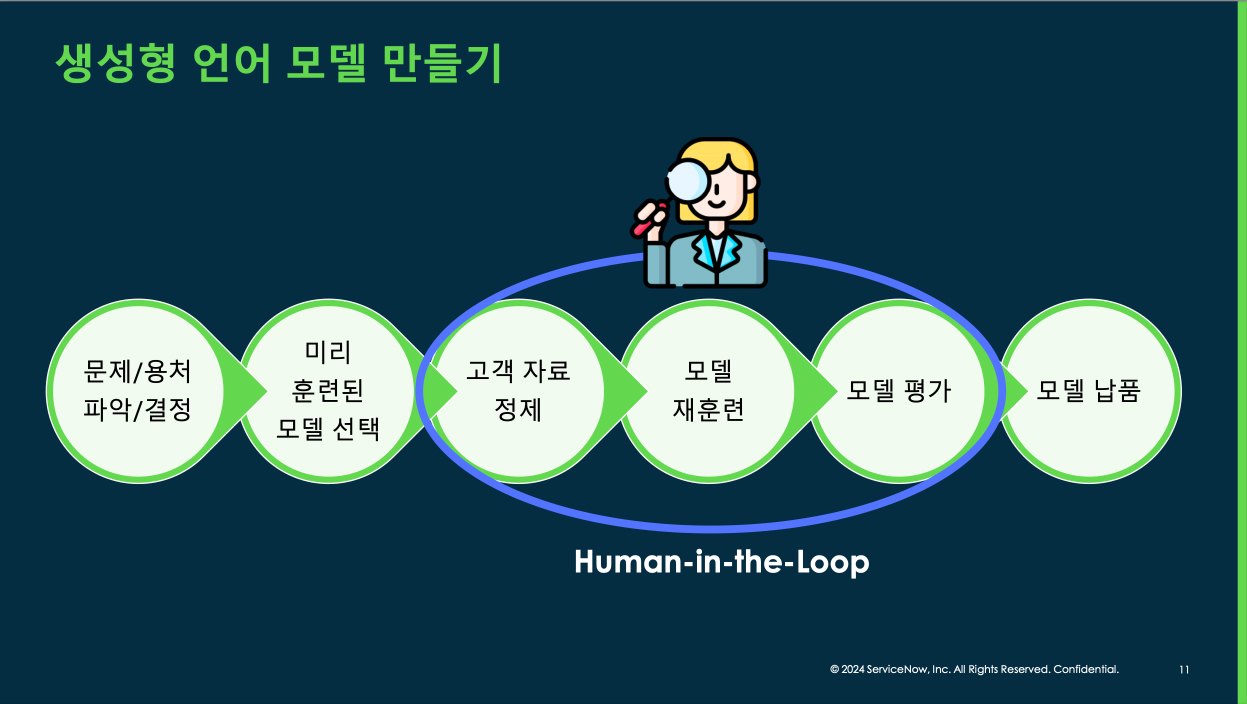 생성형 언어 모델을 만드는 과정을 알아보겠습니다. 실제로 회사에서 고객에게 모델을 맞게 출시하려면 많은 일들을 해야 해요.