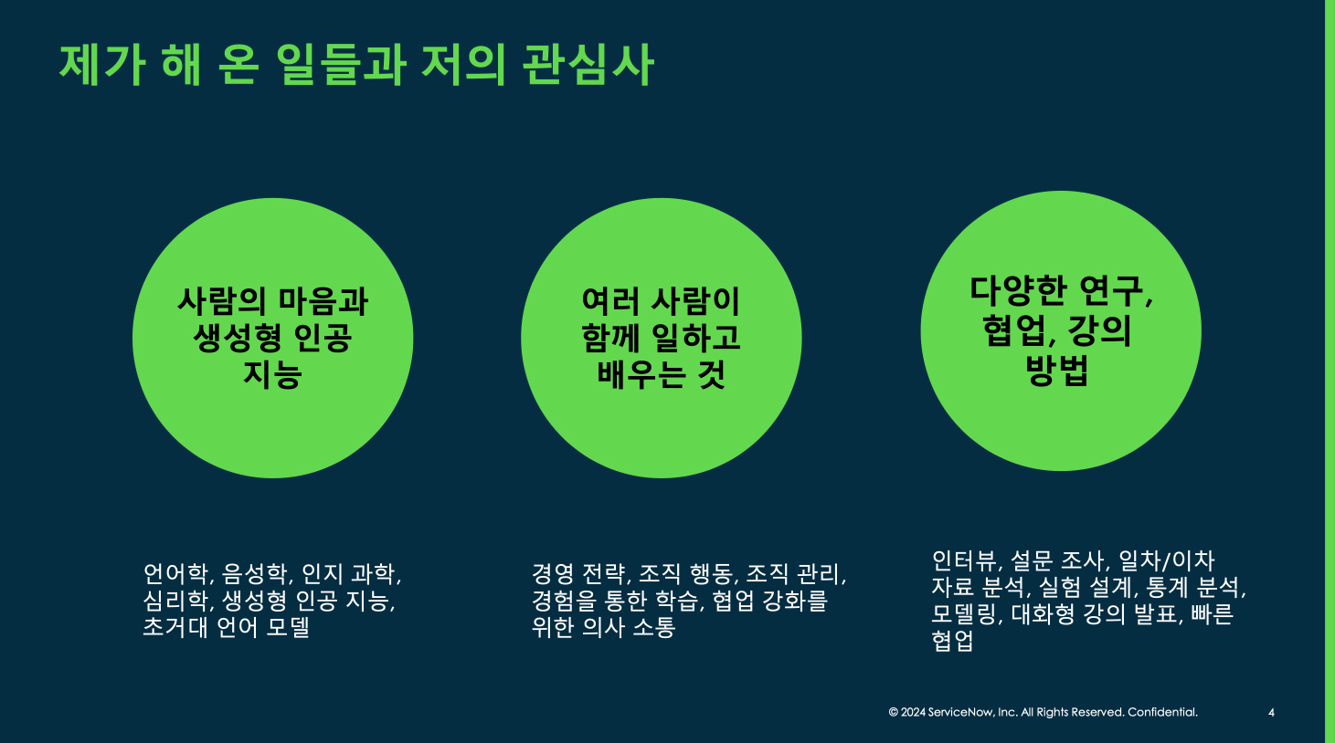 꾸준한 관심으로 오랜 기간 사람들 간의 협업과 의사소통, 특히 음성 인지 및 처리 과정에 대한 연구를 진행해 오셨습니다. 더불어 효과적인 의사소통이 개인과 조직에 미치는 영향을 깊이 탐구하며, 현재는 서비스나우에서 고객 만족도 향상과 더 나은 제품 개발에 기여하고 계십니다.