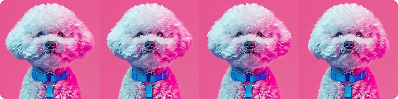 실사를 참고해 생성한 이미지는 비숑 프리제에 조금 더 가까워졌지만, 색감이나 포즈 역시 레퍼런스의 영향을 받았습니다. 전보다 분홍색이 빠지는 대신 흑백이 강조되고 비숑 프리제의 시선 방향도 달라졌습니다. 작업을 반복해도 같은 현상이 발생합니다. 그나마 미리 정해둔 스타일을 가장 많이 유지하고 있는 2번 이미지를 업스케일링한 뒤 다른 방법을 찾았습니다.