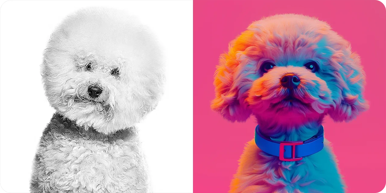 실사를 참고해 생성한 이미지는 비숑 프리제에 조금 더 가까워졌지만, 색감이나 포즈 역시 레퍼런스의 영향을 받았습니다. 전보다 분홍색이 빠지는 대신 흑백이 강조되고 비숑 프리제의 시선 방향도 달라졌습니다. 작업을 반복해도 같은 현상이 발생합니다. 그나마 미리 정해둔 스타일을 가장 많이 유지하고 있는 2번 이미지를 업스케일링한 뒤 다른 방법을 찾았습니다.