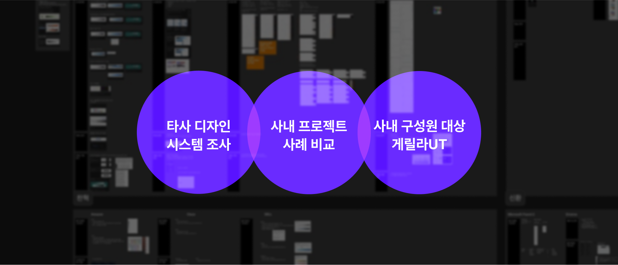 제기된 문제의 카테고리는 크게 텍스트, 컬러, 컴포넌트 등 디자인시스템에 대한 내용, 디자인-개발 간 커뮤니케이션에 대한 부분으로 나누어볼 수 있었습니다. 구체적인 해결책을 찾기 위해서 사내 프로젝트와 주요 디자인 시스템 사례를 폭넓게 조사했습니다. 조사한 내용을 한 곳에 모아 비교하면서 각 사례의 구조와 장단점을 정리한 후에는, 어떤 방향으로 해결책을 적용하는 것이 좋을지 토론하는 과정을 거쳤습니다. 그럼에도 확신이 들지 않았던 부분은 게릴라 UT를 통해 구성원들의 의견을 수집하기도 하고요.