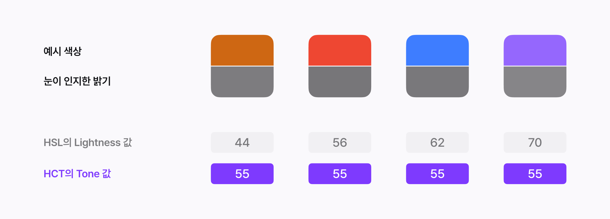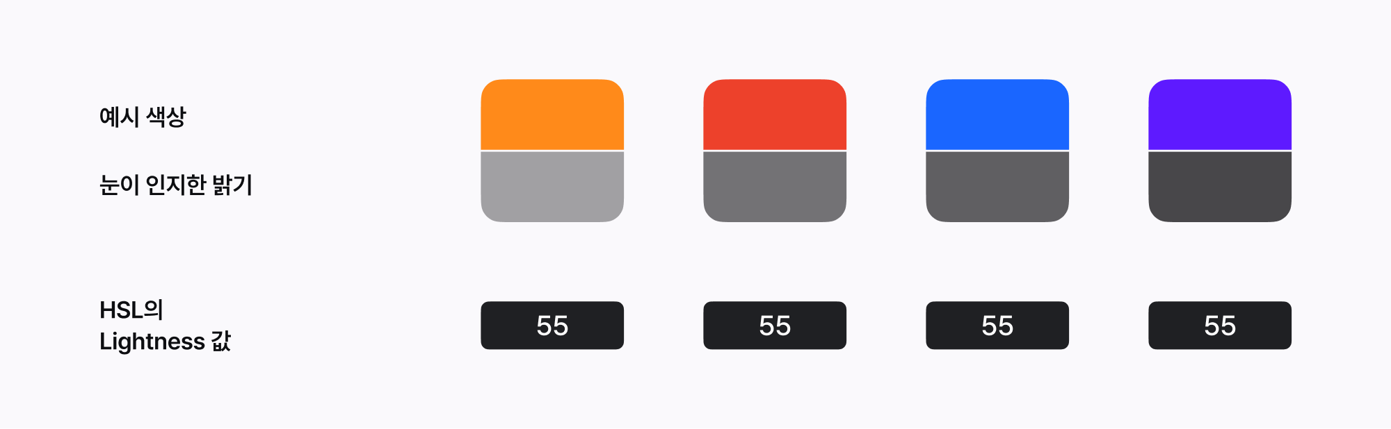 HSL 컬러 모델에서는 Lightness(밝기) 값이 동일하더라도 Hue(색조)에 따라 시각적으로 인지되는 밝기가 달라집니다. 따라서 스케일 컬러 팔레트에서 균일한 톤을 유지하려면 대비값을 조정해야 하지만, 이를 시스템으로 해결하려면 복잡한 계산이 필요하거나, 이미 만들어진 균일한 대비값 팔레트를 사용해야 합니다. 그러나 이러한 방법은 컬러 확장성에 한계가 있으며 복잡하고 어려운 것이 단점입니다.