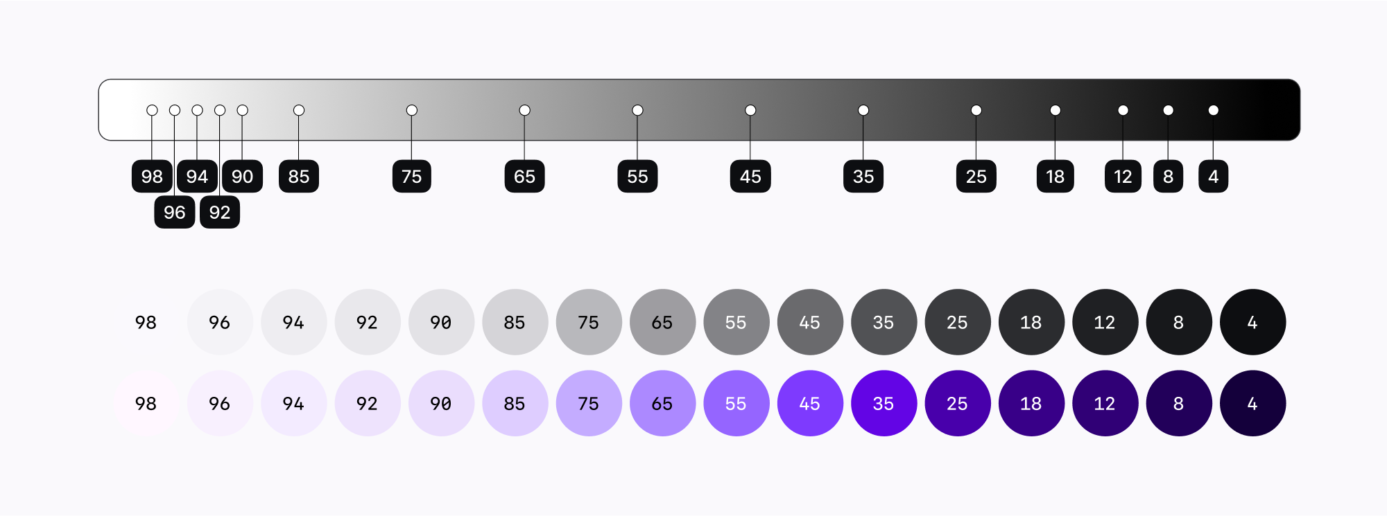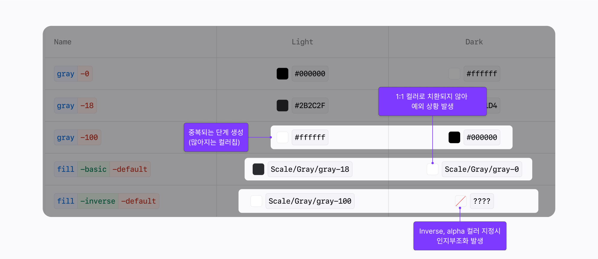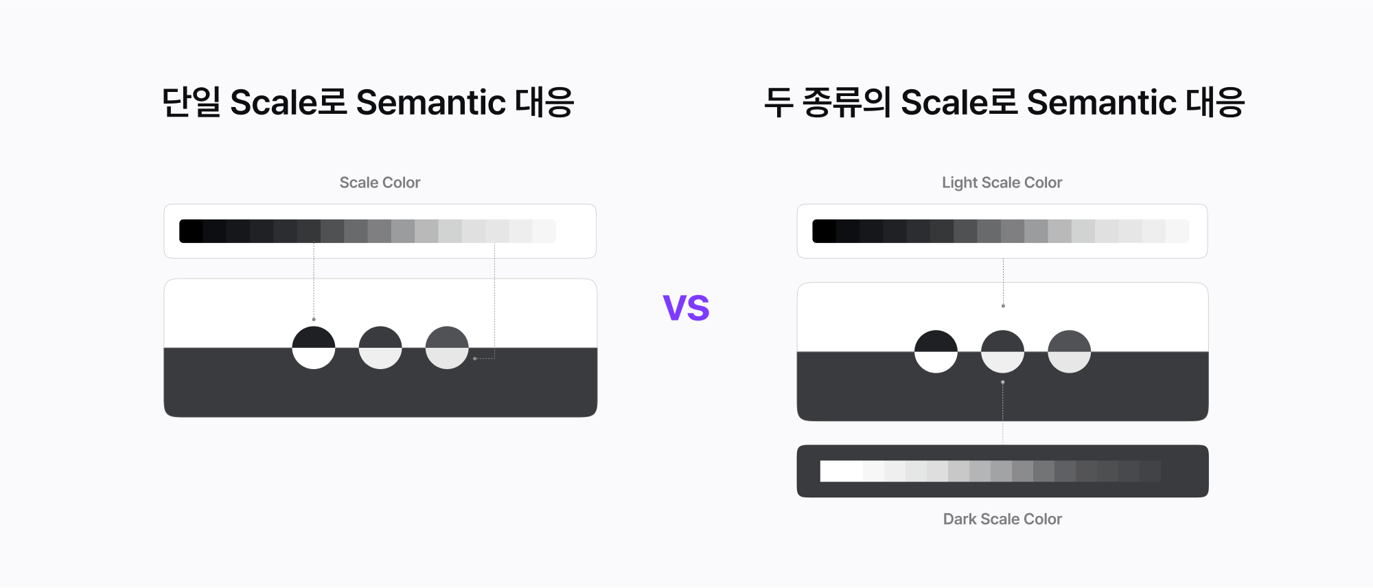 단일 스케일로 대응할 경우, 컬러 토큰을 경제적으로 운용할 수 있는 장점이 있지만, 별도의 스케일로 대응할 경우 관리 효율성이 떨어지고 예외 상황이 발생할 수 있어서 단일 스케일로 시맨틱 컬러에 대응하는 방향으로 팔레트를 구성했습니다.