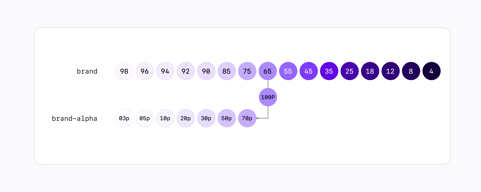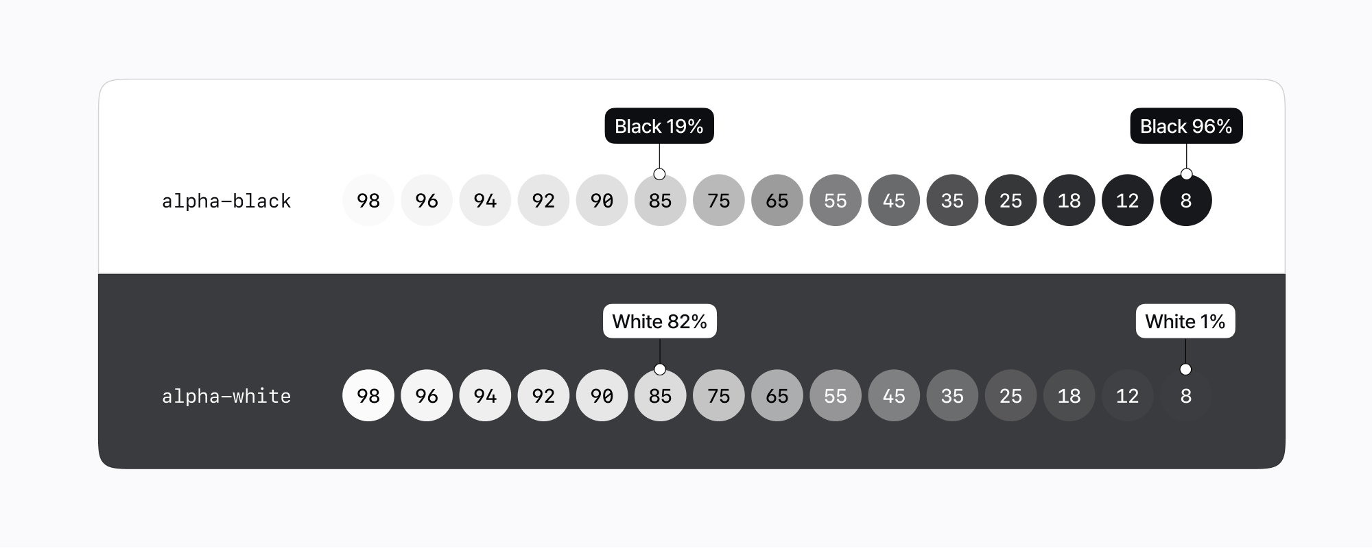 유채색 Alpha 컬러는 Solid 컬러의 Tone 65를 기준으로, 낮은 대비값의 6단계만 지원하며 컬러 토큰의 이름은 실제 Opacity 값을 따릅니다.