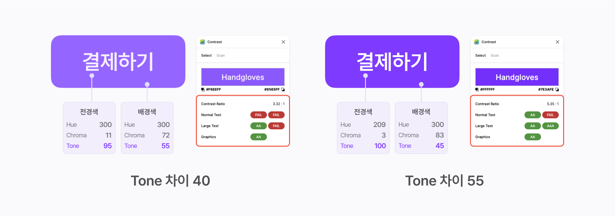 HCT 컬러 모델을 도입한 후 가장 큰 장점은 웹 접근성 지침(Web Content Accessibility Guideline, WCAG)에 따른 컬러 대비값을 손쉽게 계산할 수 있다는 점이었습니다. 전경색(Foreground Color)과 배경색(Background Color)의 톤값 차이가 40 이상이면 WCAG Large Text(3:1) 기준을, 50 이상이면 WCAG Normal Text(4.5:1) 기준을 통과할 수 있습니다. 이를 통해 스케일 컬러를 시맨틱 컬러 토큰에 적용할 때 수치만으로 접근성을 쉽게 확인할 수 있게 됐습니다.