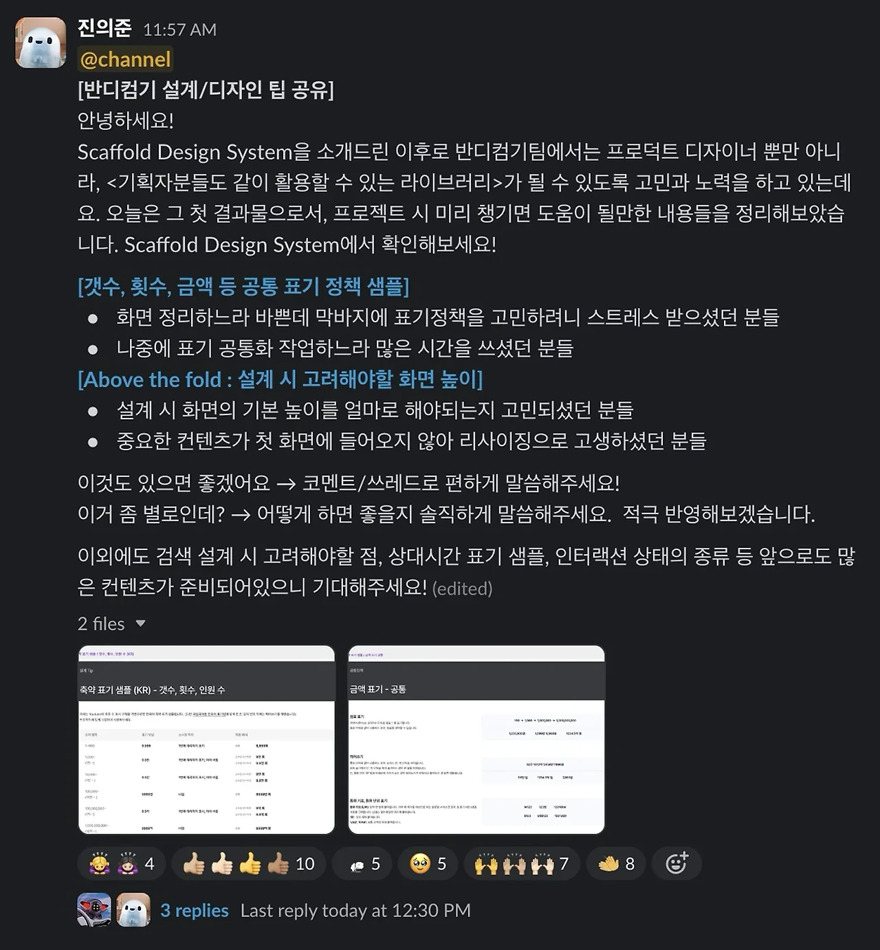 인터뷰를 통해 기획 직군이 필요로 하는 새로운 요구 사항을 발견할 수 있었는데요. 금액, 축약 표기 등을 위한 공통 표기 정책과 자주 쓰는 UX 패턴을 위한 설계서 가이드가 디자인 시스템에 반영되면 좋겠다는 의견을 수집했습니다. 곧바로 이를 반영해 보기로 했죠. 스캐폴드 시스템의 완성도를 높이는 건 물론, 더 많은 구성원의 관심을 끌 수 있겠다는 판단에 따른 결정이었습니다. 인터뷰에서 얻은 인사이트를 바탕으로 스캐폴드 시스템의 콘텐츠를 보완했고, 아래 이미지처럼 피엑스디 구성원에게 공유했습니다.
