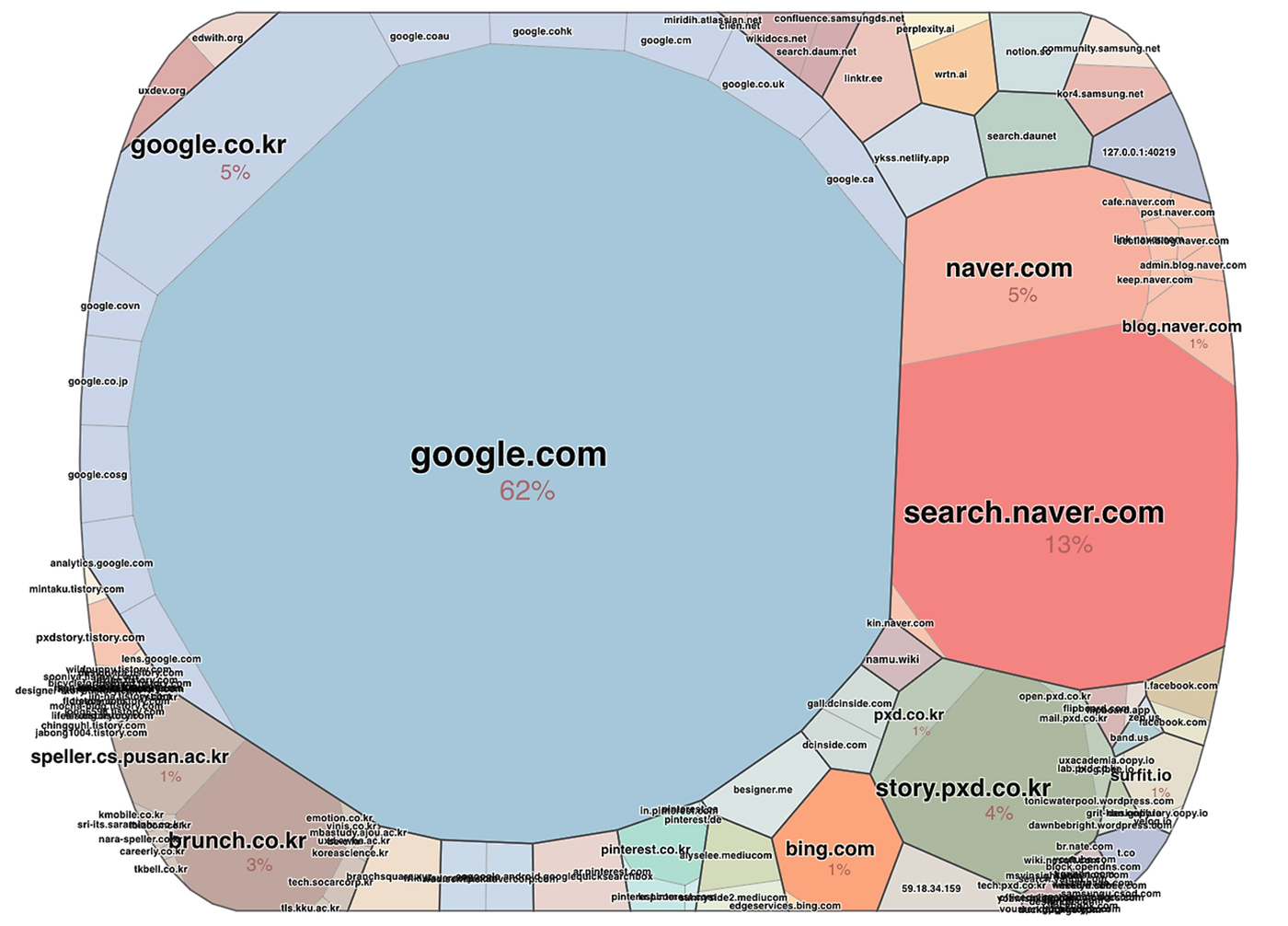 먼저, 사용자 유입 경로를 알아봅니다. 검색 엔진을 사용했는지, 사이트 주소를 직접 입력했는지에 따라 사용자가 서비스를 이용하는 배경과 목적이 다르기 때문입니다. 또, 사용자에 따라 검색 엔진을 이용하는 방식이 달라서 유입 경로는 사용자를 이해할 때 기본으로 파악하는 정보입니다. 위 이미지처럼 유입 경로 데이터가 많을 때는 대표 주소로 묶어보면 한눈에 파악하는 데 도움이 됩니다. 피엑스디 블로그는 대부분의 사용자가 검색 엔진을 통해 들어오며, 자체 링크나 브런치 소개 글 또는 부산대 맞춤법 검사기를 거쳐 방문하는 사용자도 있습니다.