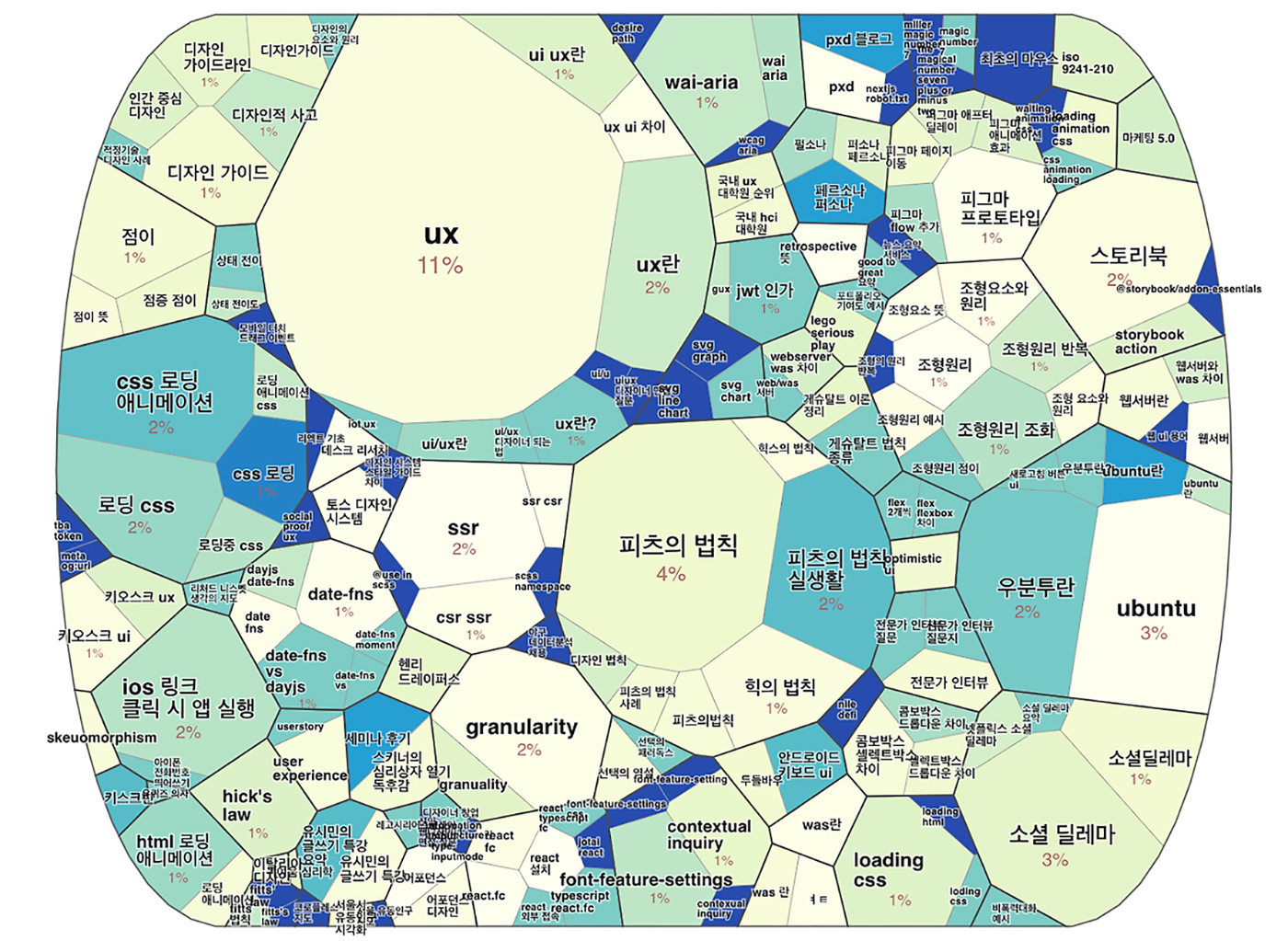 워드 버블로 시간에 따라 달라지는 키워드를 비교하면 트렌드에 맞춰 마케팅, 상품 전략 등을 세울 수 있습니다. 2월에 가장 비중이 컸던 ‘UIUX’가 5월에는 작아졌습니다. 해당 키워드 검색이 줄었다는 것이죠. 반면, ‘조형 요소와 원리’ 키워드로 유입된 사용자가 늘었습니다. 이는 학기 중이라 전체 사용자에서 학생들의 비중이 상대적으로 늘어나면서 디자인 분야의 중요 개념을 검색한 것으로 볼 수 있습니다.