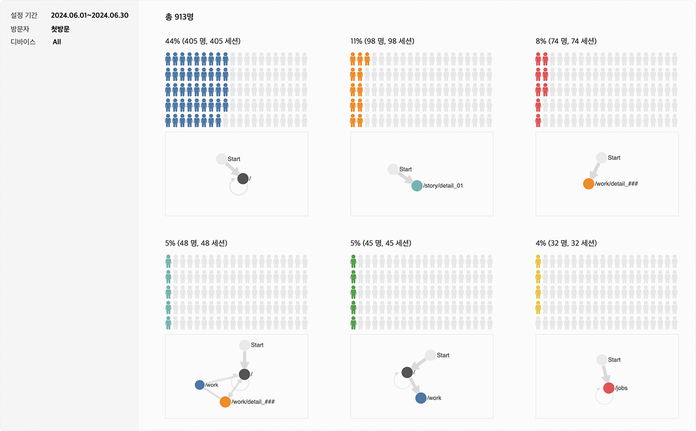pxd 홈페이지를 처음 방문한 사용자들의 페이지 이동 유형을 세분화해 시각화한 결과