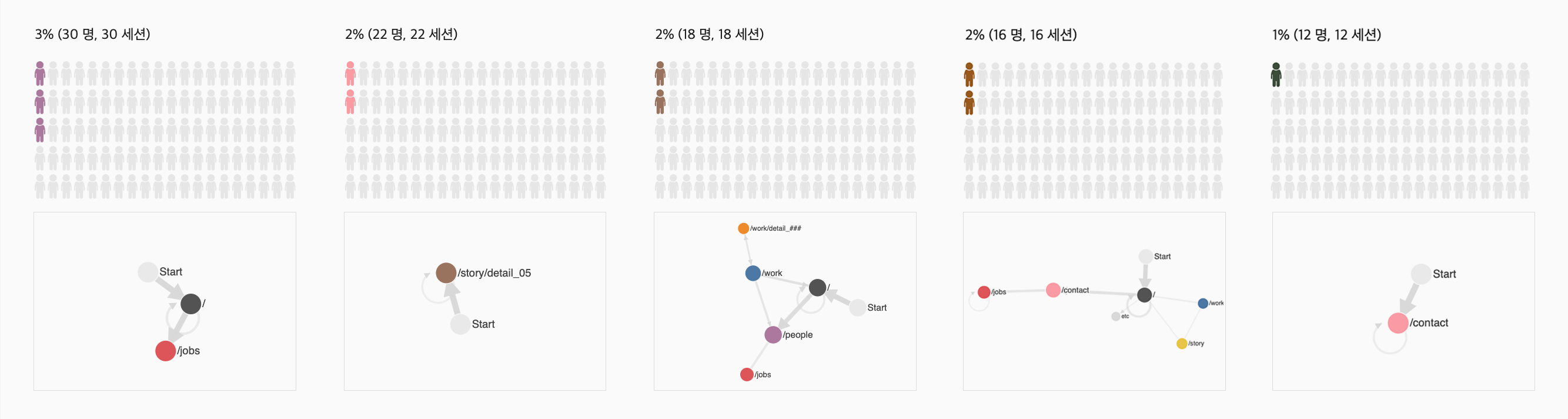 홈을 거치지 않고 워크 페이지를 방문한 경우(8%)는 ‘피엑스디가 어떤 일을 했는지’가 궁금한 것이 아니고, 프로젝트와 연관된 검색어를 통해 들어온 경우여서 잠재 고객일 가능성이 적습니다. 전체 중 11%인 두 번째 유형은 채용(jobs)과 조직 문화(people), 연락처(contact) 관련 페이지에 머문 것을 보면 채용 정보를 확인한 구직자라고 할 수 있습니다. 각 페이지에서 채용 정보와 지원 방법, 회사의 조직 문화 등을 찾아본 것으로 생각됩니다.