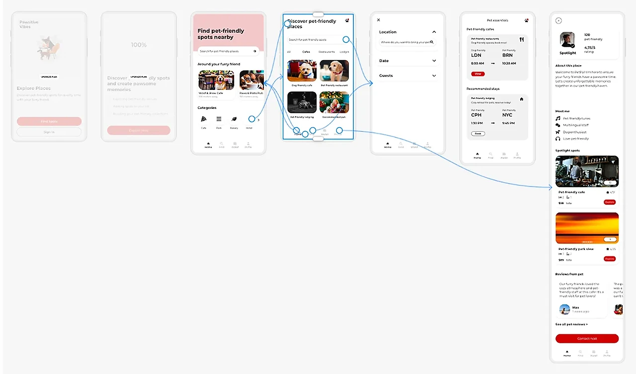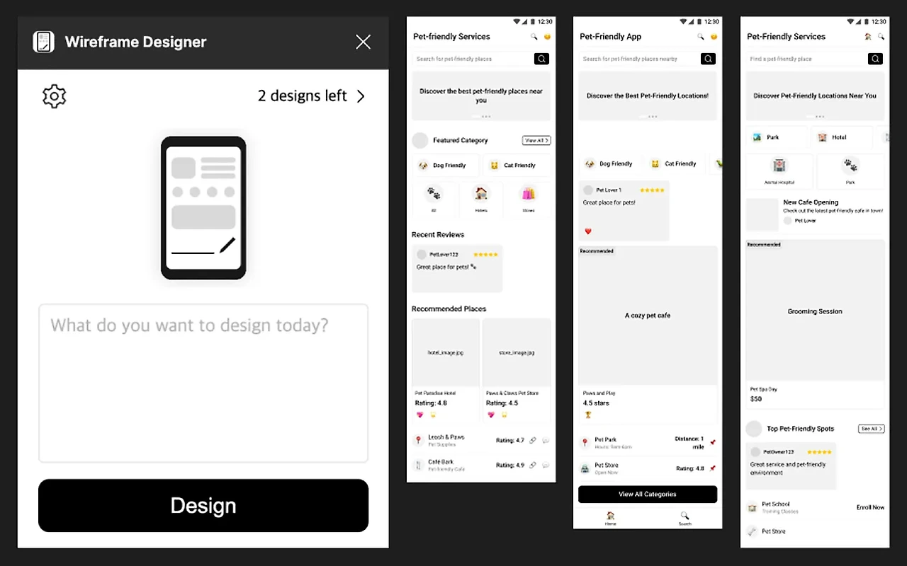여러 AI 툴이 만든 결과물을 참고해 와이어프레임을 완성했어요. 검색을 위한 상단 서치바, 사용자가 직접 찾지 않아도 정보를 얻을 수 있는 콘텐츠 배너, 빠른 접근을 돕는 카테고리 메뉴, 이용 후기, 추천 장소 등으로 구성했죠. 마지막으로 서비스 이름 짓기는 챗 사원에게 부탁했는데요. 챗 사원이 제안한 50여 개의 이름 중 가장 발음이 쉽고 장소 연관 서비스의 성격을 잘 표현한 ‘펫츠고(PetsGo)’를 선택했어요. 드디어 우리의 서비스 기획을 마쳤습니다!