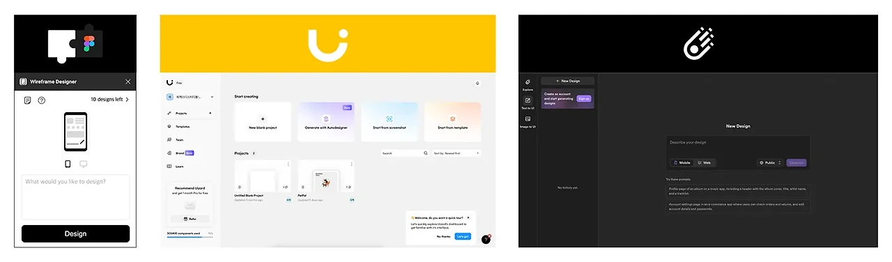 유아이자드는 프롬프트를 입력하면 5개 이상의 화면과 프로토타입을 생성해요. 모바일, 태블릿, PC 등의 디바이스를 선택할 수 있죠. 결과물은 비교적 다양한 컴포넌트로 구성, 관련 텍스트와 이미지가 포함돼요. 다만, 결과물을 피그마에서 편집할 수 없는 데다 무료 버전에서는 5개 화면만 편집할 수 있다는 점에서 활용도가 떨어졌어요.