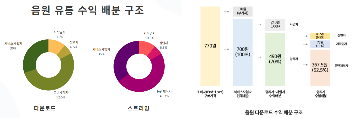 아티스트가 신곡을 발표하면, 앨범을 구매하거나 음원을 무한 스트리밍하는 것은 가장 대표적이고 기본적인 팬 활동입니다. 이런 팬 활동은 아티스트의 음악을 즐기고 지원하기 위해서도 중요하지만, 아티스트의 수익 창출 관점에서도 중요한 활동입니다. 그런데 지금의 정산 구조는 음원 수익에 대해 아티스트, 즉 실연자 분배 비율이 일반적으로 6%로 아티스트의 수익 비율이 매우 낮습니다.