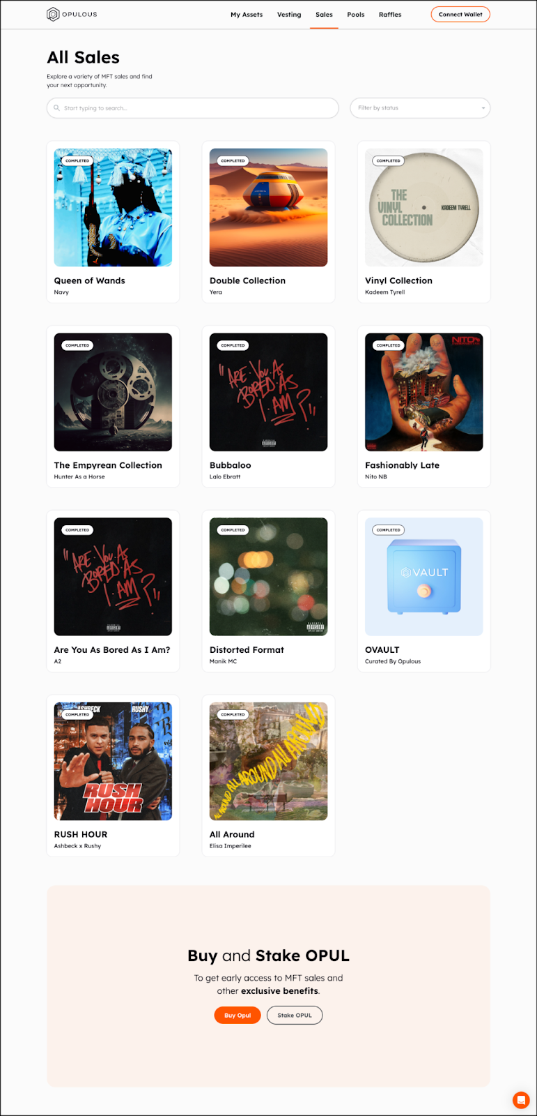Opulous는 좋아하는 아티스트에게 직접 투자하는 서비스입니다. 팬이 암호화폐나 달러로 아티스트의 프로젝트 소유권 일부를 구매합니다. 구매를 마치면 ‘MFT(Music Fungible Token)’를 수령합니다. MFT를 보유하면 추후에 아티스트의 프로젝트 수익을 일부 분배받을 수 있고, MFT를 마켓플레이스 내에서 판매하거나 서비스에서 발행한 OPUL 토큰으로 교환하는 등의 방법으로 수익화할 수도 있습니다. 아티스트는 팬의 투자금을 프로젝트 자금으로 사용하여 더 좋은 음악과 앨범을 만들기 위해 노력합니다.