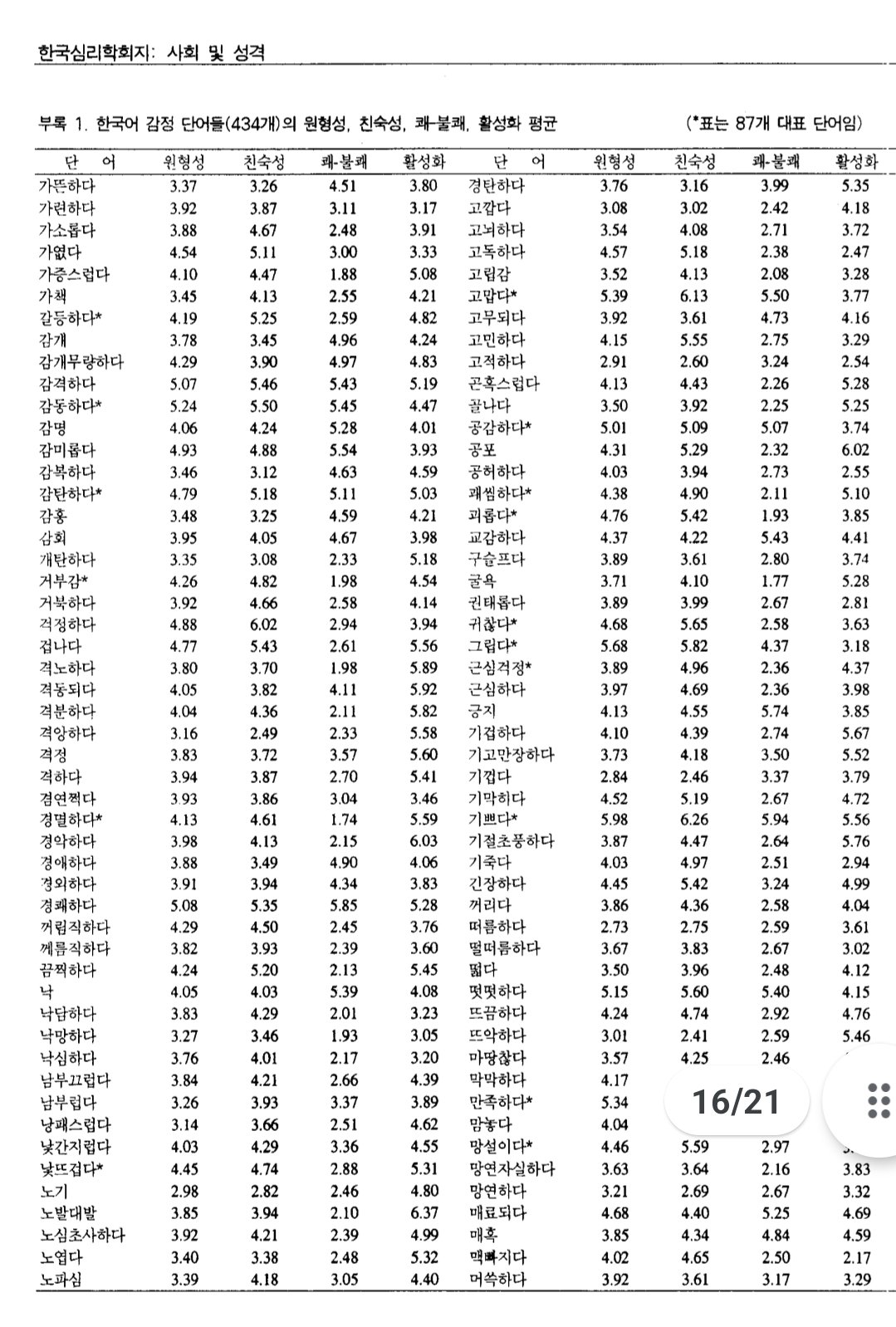 한국어 감정 단어를 정리한 표가 트위터에서 인기를 얻었습니다. 자신의 감정을 표현하는데 적당한 단어가 잘 떠오르지 않는다는 트윗에 인용으로 한국어 감정단어의 목록 작성과 차원 탐색 논문에서 수집한 감정단어 434개 한국어 감정 단어 목록을 공유해 주셨습니다. 요즘 미쳤다라는 표현이 심지어 방송에서도 남용되어 우려하는 목소리가 많은데요. 감정 어휘의 부족이 소통을 피상적으로 만드는 것 같습니다. 감정 어휘가 늘어 날 수록 자신의 감정을 보다 적확하게 표현하는것 뿐 아니라 자기 감정을 정확하게 아는데도 도움이 된다고 합니다.