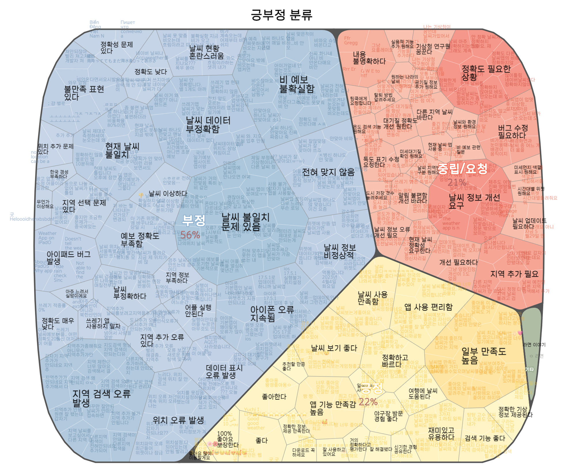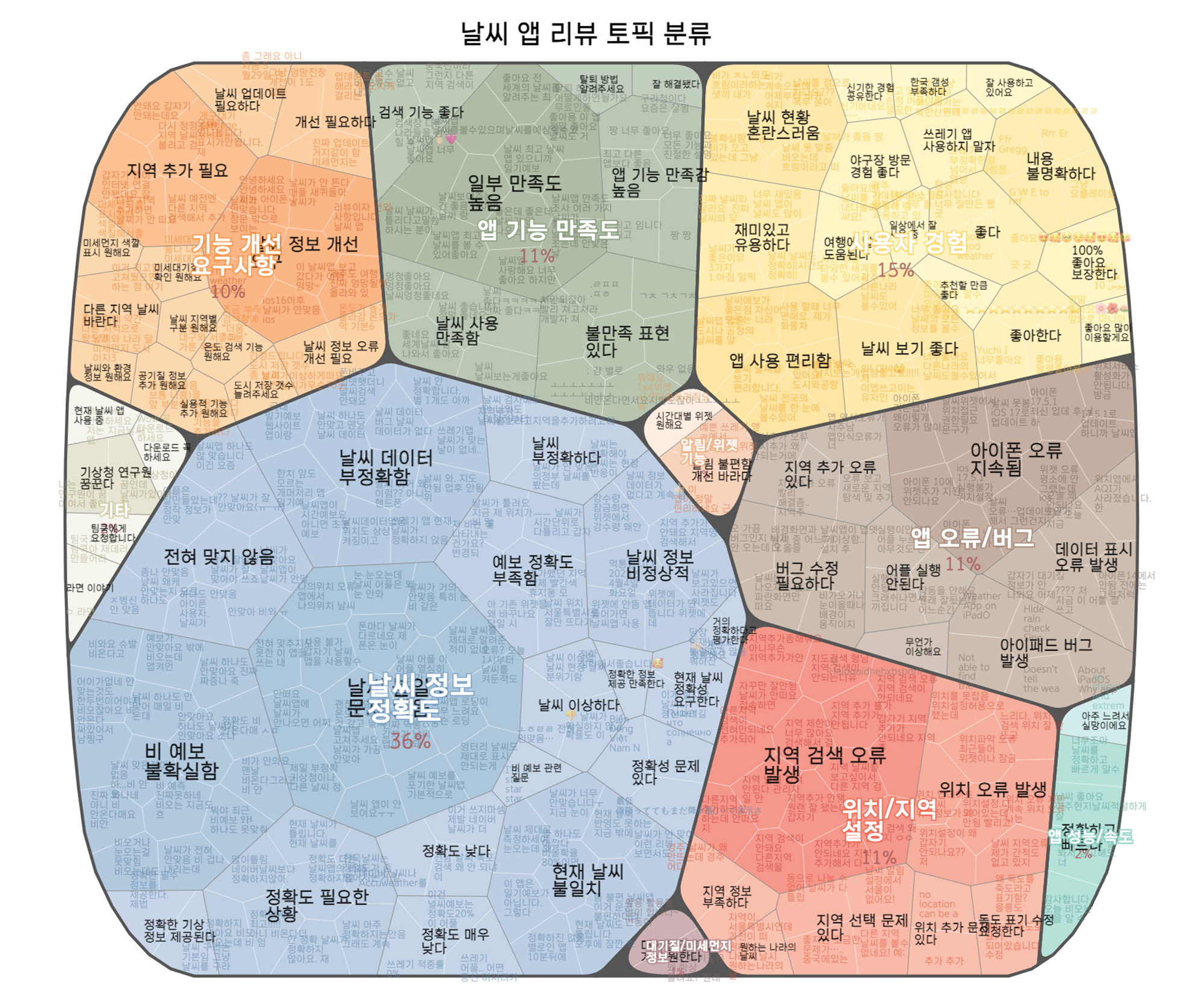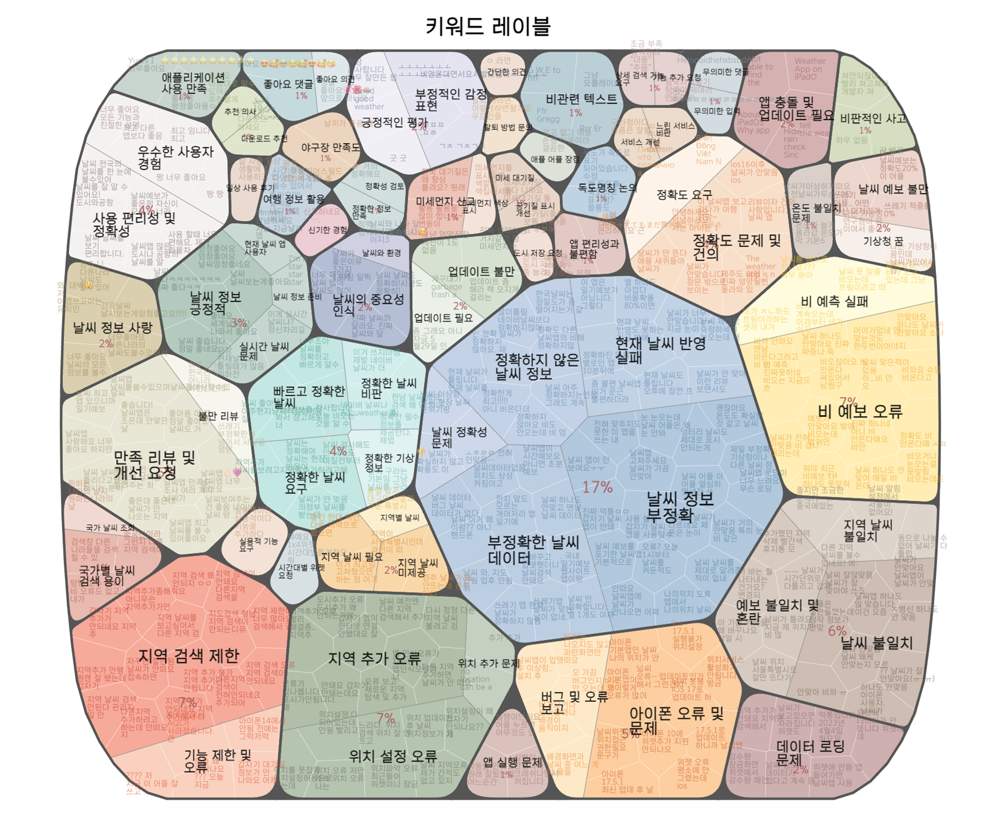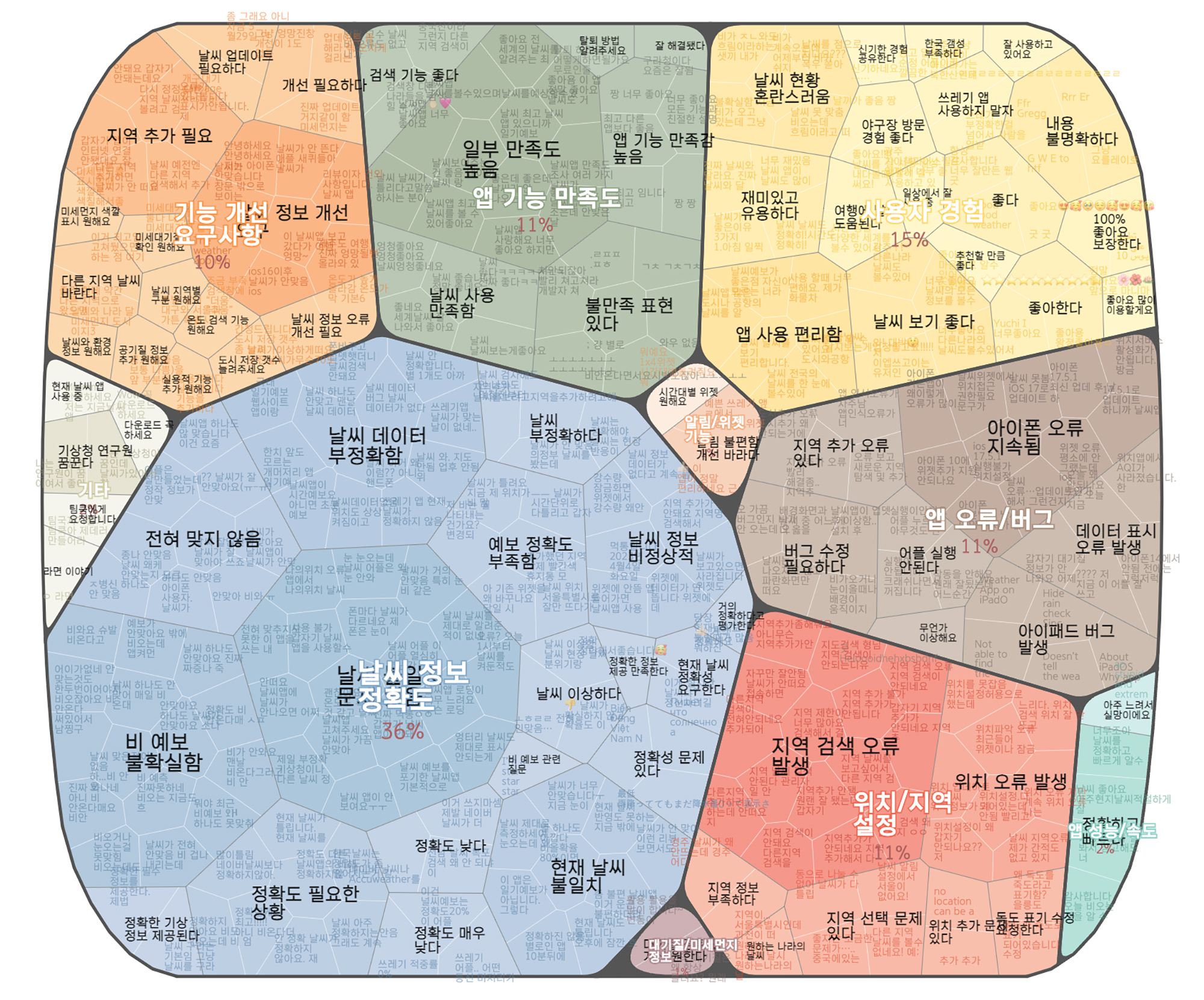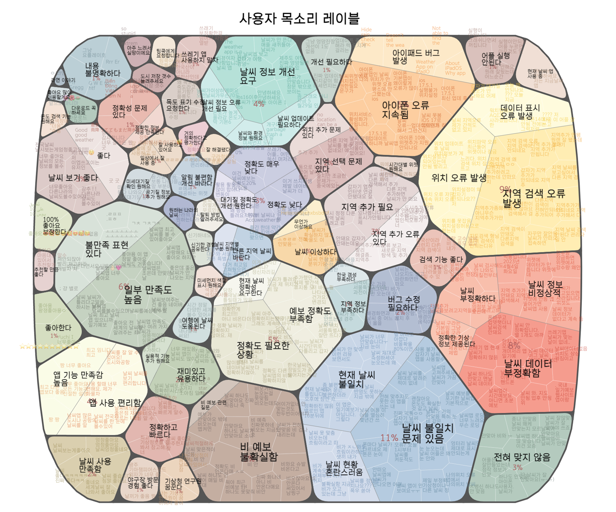 텍스트 데이터 분석에서 널리 쓰이고 있는 ‘워드클라우드’는 단순히 많이 노출된 단어의 분포도를 보여주는 것이지만, 어피니티버블은 데이터에서 주제를 도출하고 정량적으로 시각화합니다. 즉, 트리맵 구조로 1차 묶은 주제와 그 그룹을 2차로 다시 묶어 추상화한 주제를 담고 있어 다양한 층위로 많은 정보를 효과적으로 전달할 수 있습니다.